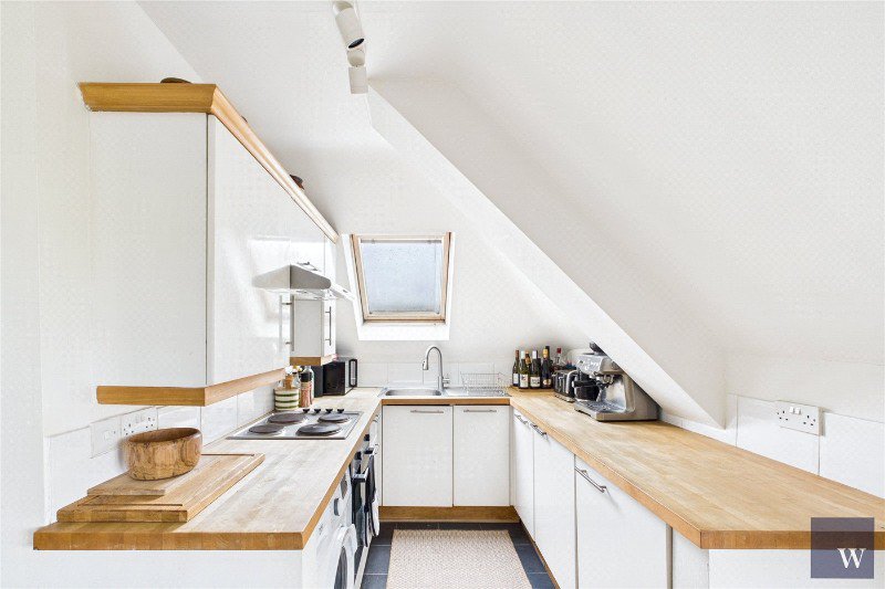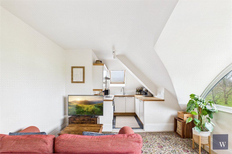 The flat opens into a welcoming central hallway leading through to a generous open-plan reception room and kitchen. This bright and sociable space is perfect for both relaxing and entertaining, with ample room for a dining table and comfortable seating. The kitchen is neatly arranged to one side with good storage and worktop space, while the living area is anchored by the impressive arched window, flooding the room with light and creating a wonderful sense of openness.