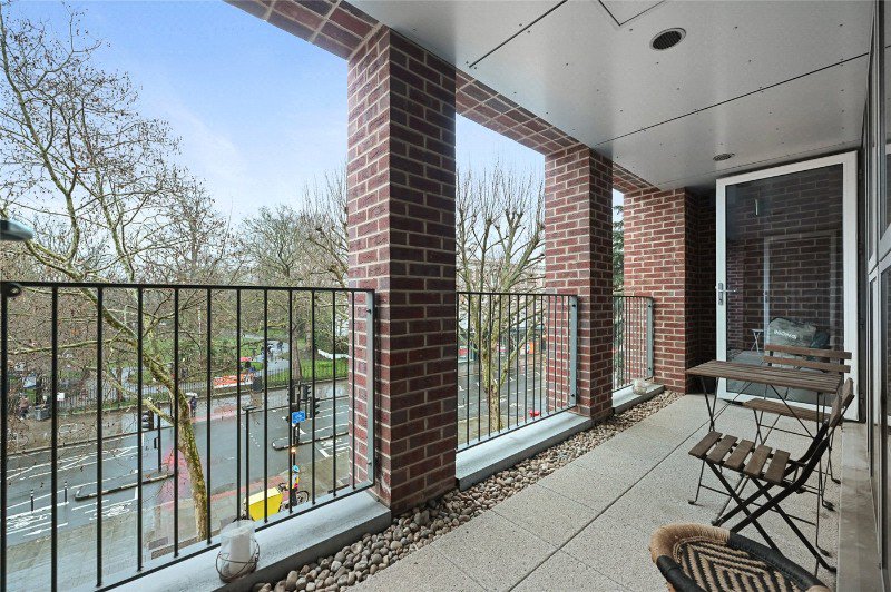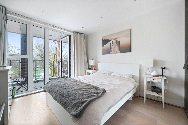 The generously sized bedroom includes built-in wardrobe space and also benefits from direct access to the balcony, which enjoys attractive views overlooking Ravenscourt Park.