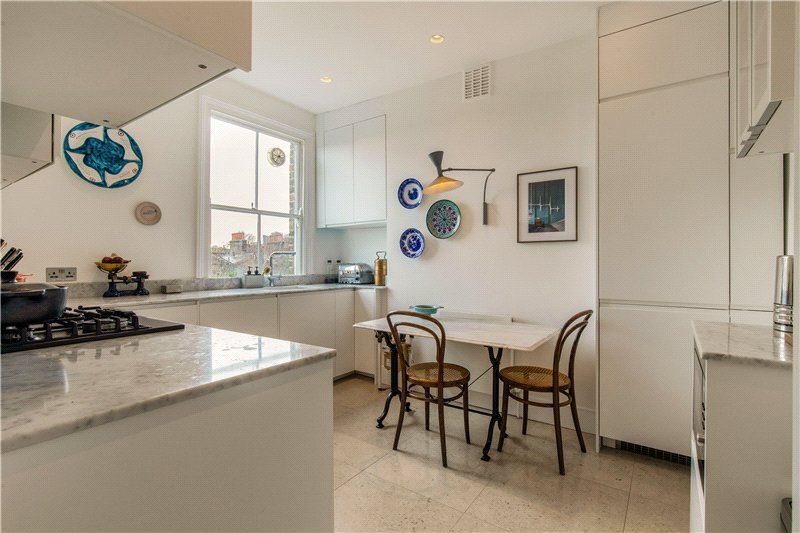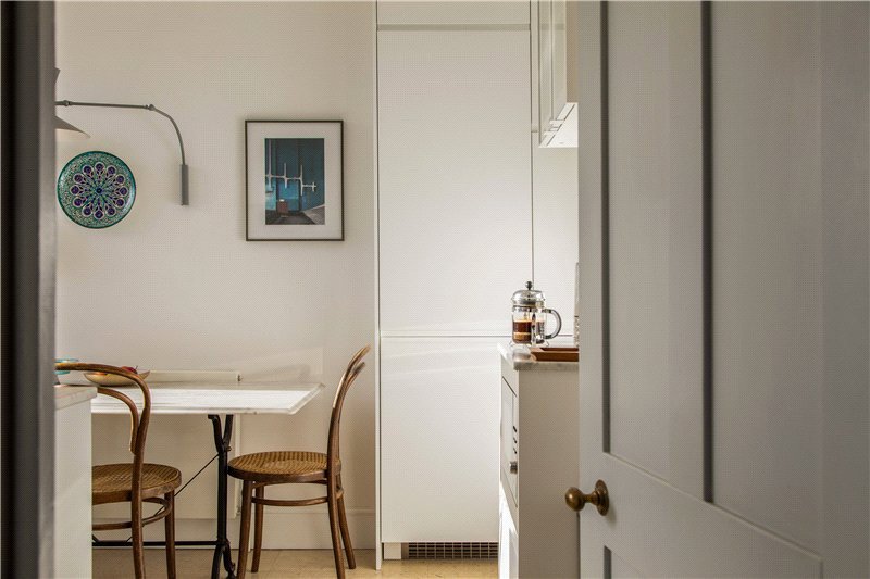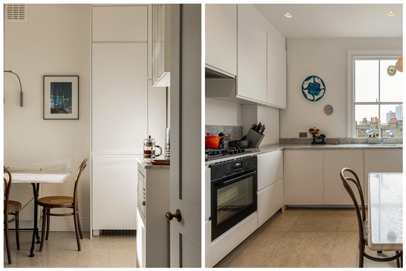 The kitchen has been finished to an impeccable standard, featuring honed Carrara worktops, a gas oven and hob, and sleek, stylish cabinetry that offers excellent storage. There is also space for a four-seater dining table, ideal for intimate dining.