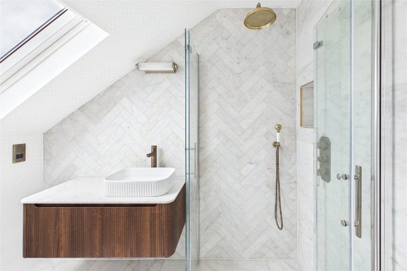 Also on this level is a well proportioned double bedroom and a beautifully finished shower room, ideal for guests or flexible use. Upstairs, the principal bedroom forms a private top floor suite, complete with a luxurious en suite wet room. Both bathrooms are finished with real Calacatta veined marble and benefit from smart underfloor heating, adding a considered touch of comfort.