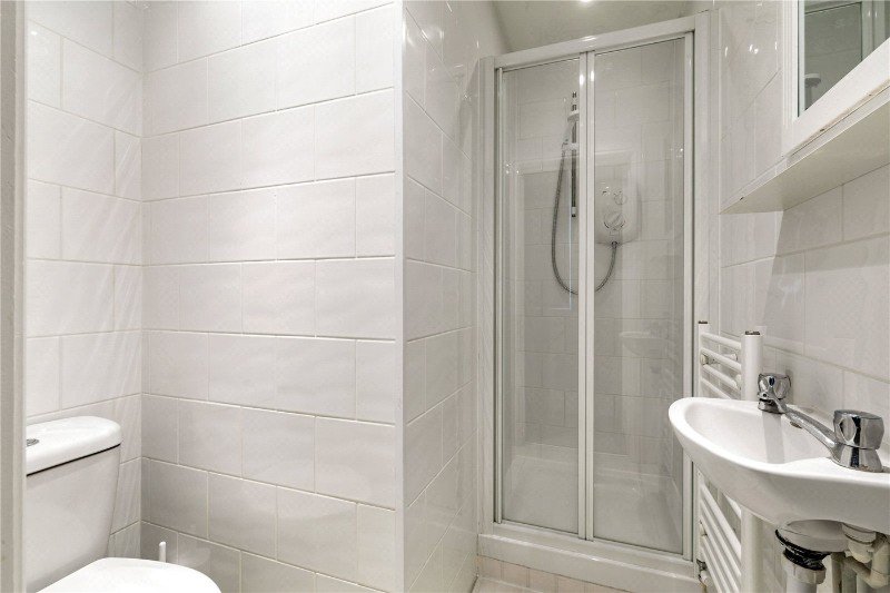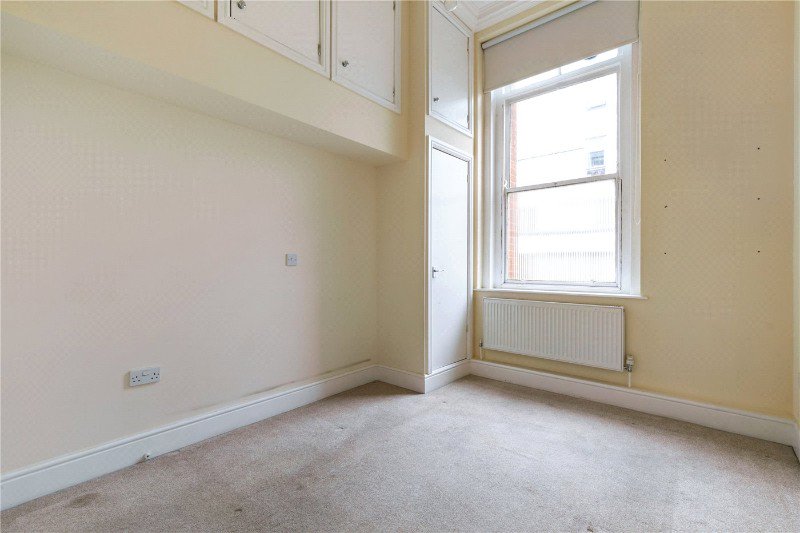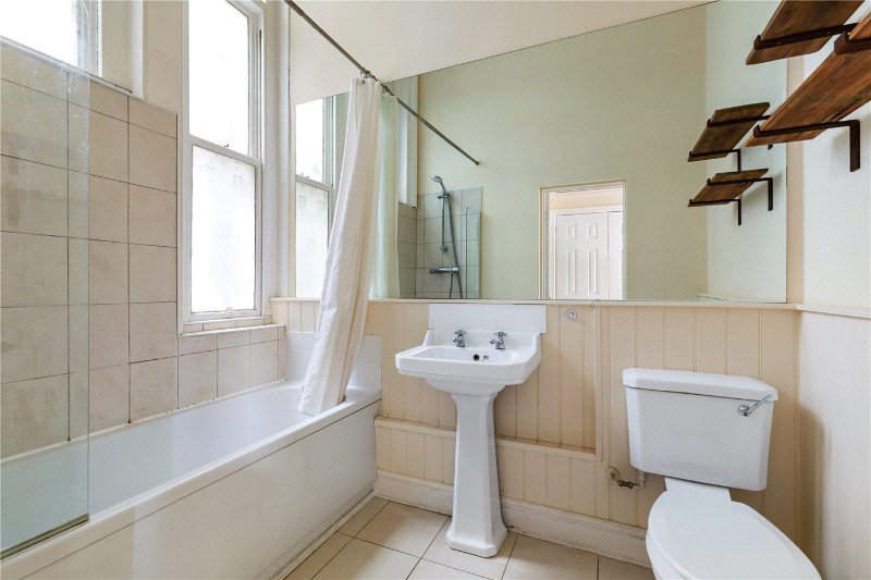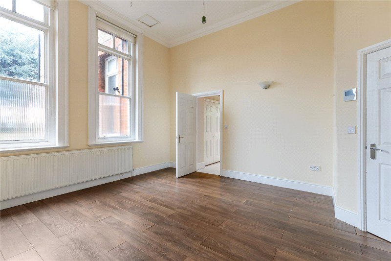 You enter directly into the reception room, a light-filled living and dining space enhanced by large sash windows and impressive ceiling height. The separate kitchen sits just off the living area and is fitted with shaker-style units, timber worktops and integrated appliances, offering both style and practicality.