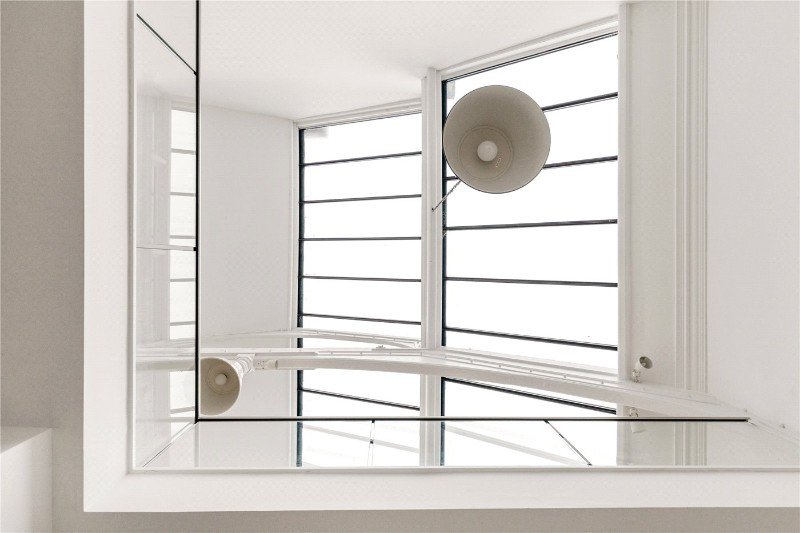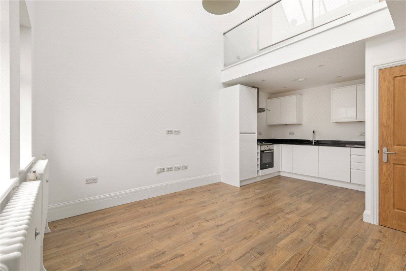 A staircase leads to a mezzanine level, ideal as a home office, guest sleeping area, or creative space, while the double bedroom is bright and airy, benefiting from the same impressive south-facing glazing. A contemporary shower room and built-in storage complete the apartment.