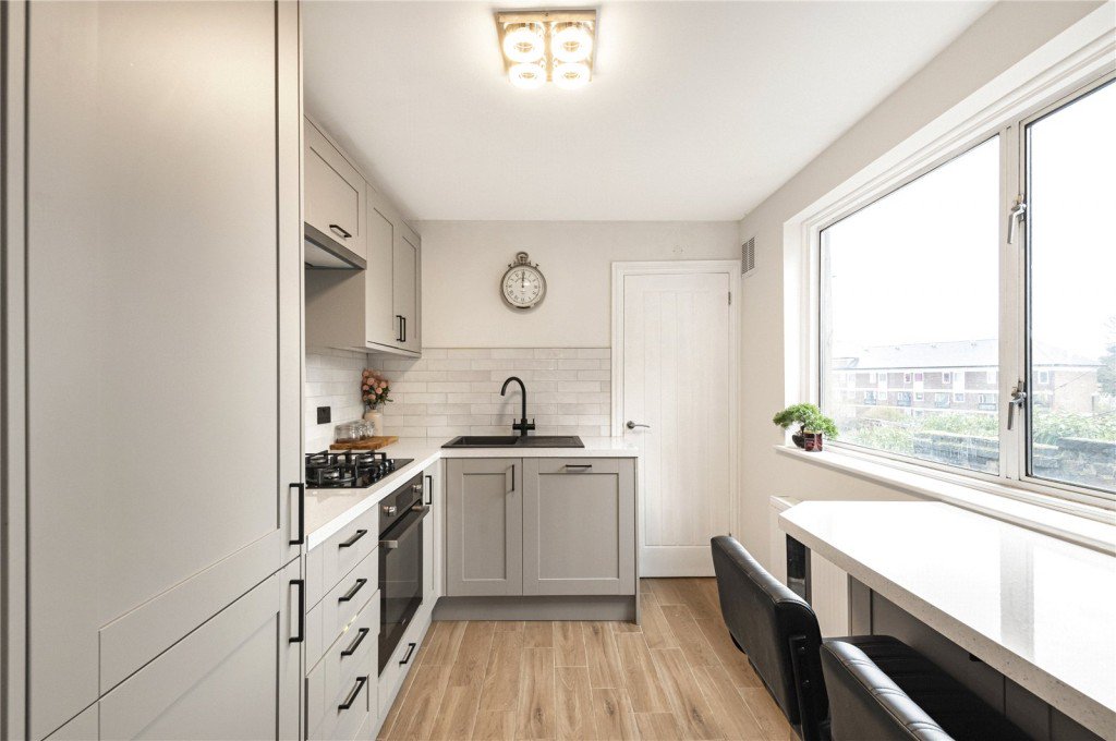 Adjoining the living space is a modern, sleek kitchen featuring generous worktop space, plenty of storage, and a convenient breakfast bar – ideal for casual dining or quick meals.