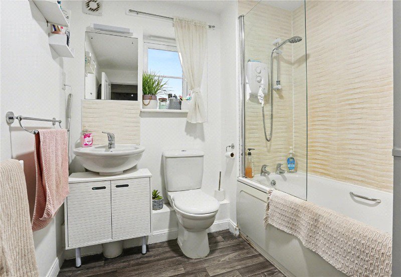 Two well-proportioned bedrooms are positioned off the hallway, creating a sense of privacy away from the main living area. Each room offers flexible accommodation, suitable as comfortable doubles, guest rooms or a dedicated home office. Completing the apartment is a smart three-piece bathroom, finished in a clean, contemporary design.