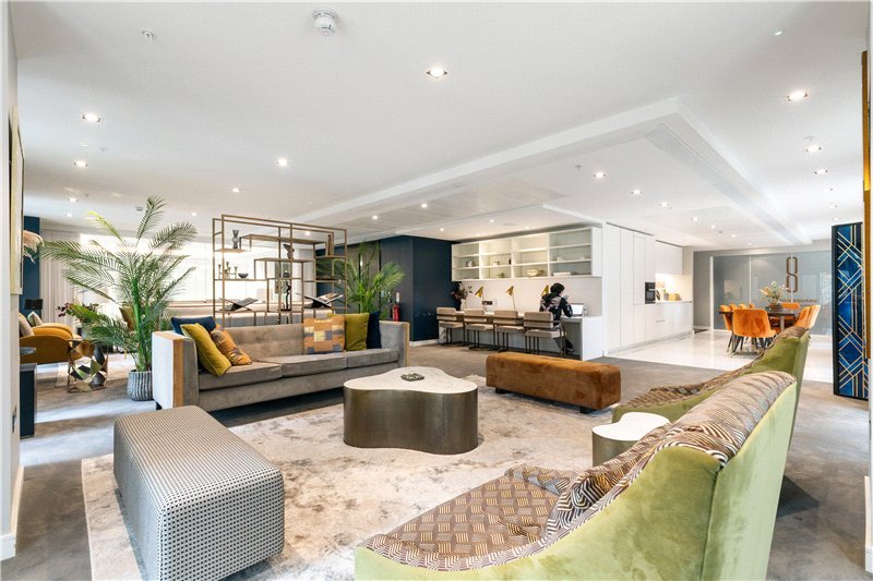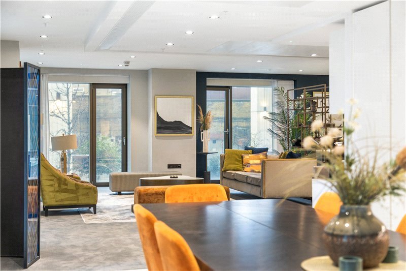 The living area comfortably accommodates a large sofa, additional freestanding furniture, and a dining table with chairs. Floor-to-ceiling windows flood the space with natural light and offer stunning views across the city and the River Thames.