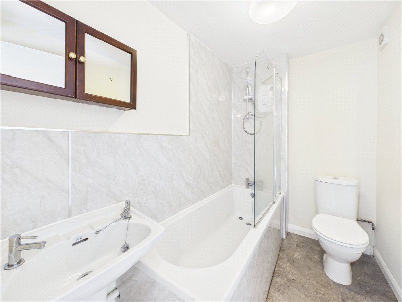 The modern fitted bathroom has a shower over bath and electric heated towel rail.