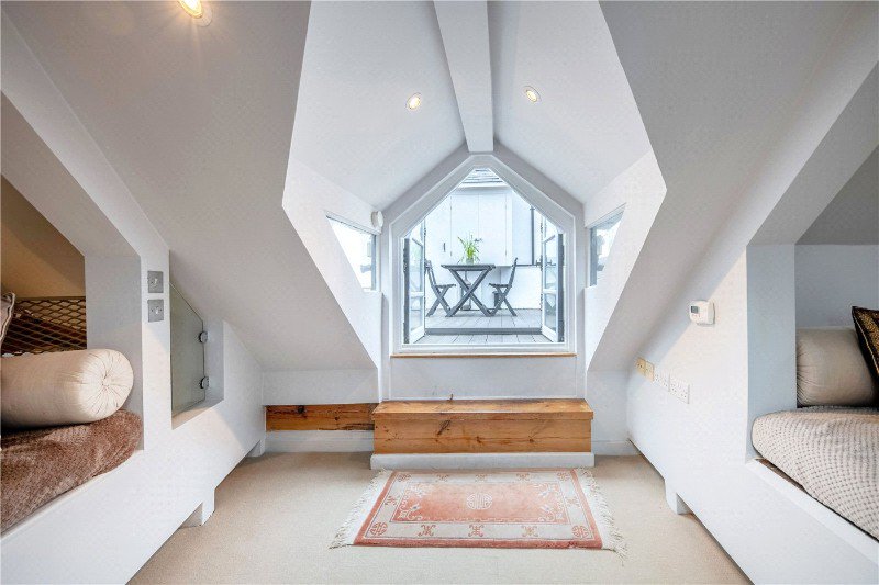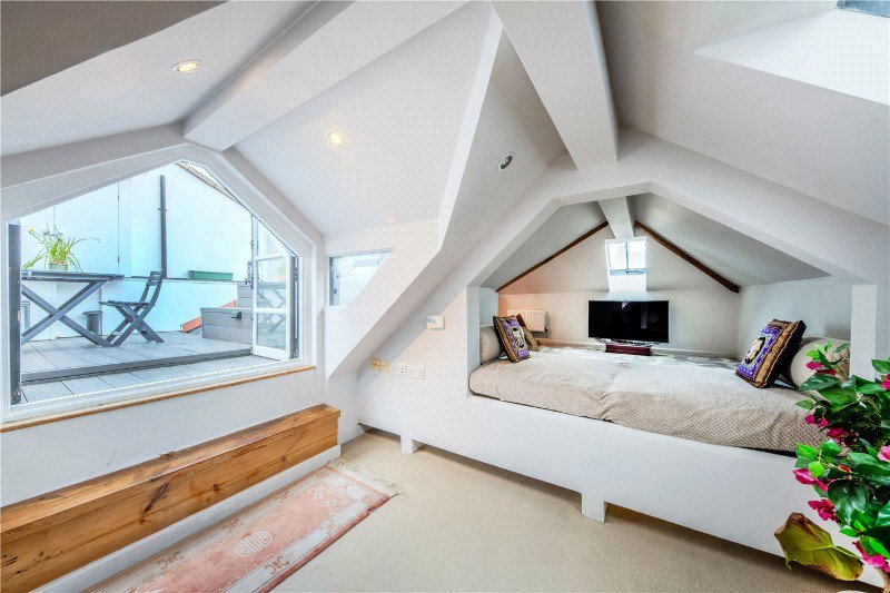An exceptional two bedroom loft style apartment with 26' reception room which has an impressive vaulted ceiling. Above the reception room is a mezzanine level which has access to a sunny and secluded roof terrace. The well-appointed open plan kitchen is situated off the reception room. The principal bedroom suite has a modern en suite bathroom and the second bedroom is served by a separate shower room.