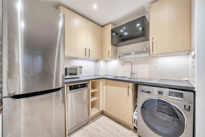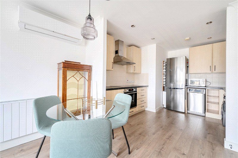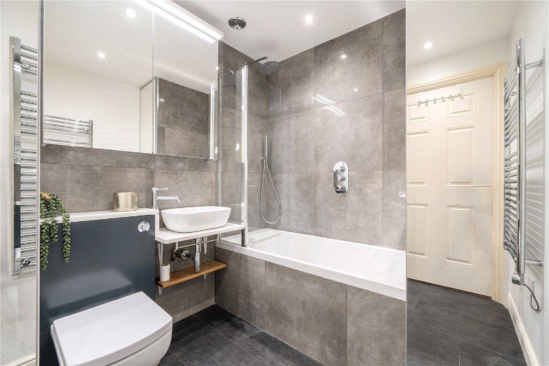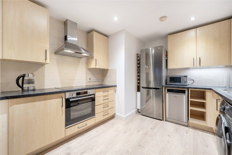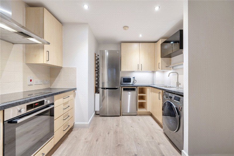 The apartment is sensibly configured, delivering an open-plan kitchen and reception space that benefits from an east-facing aspect, ensuring strong natural light throughout the day but not too hot in the summer. Both bedrooms are generously proportioned, while the contemporary family bathroom has been intelligently re-designed to maximise storage without compromising on finish or functionality. The entrance hallway sets the tone being spacious, welcoming, and is complemented by a substantial built-in storage cupboard. A newly installed Megaflo hot water system underpins the property, providing reliable, high-performance hot water on demand.