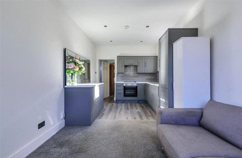 The property offers a modern interior throughout, featuring an open-plan kitchen and living area with fitted appliances, a luxurious bathroom, and a well-proportioned separate bedroom.