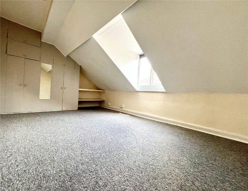 From the bedroom, a further door opens into the bathroom, which includes a cupboard housing the hot water tank. The bathroom is fitted with a matching white suite, comprising a bath with an electric shower over, and is complemented by a Velux window to the rear elevation.
