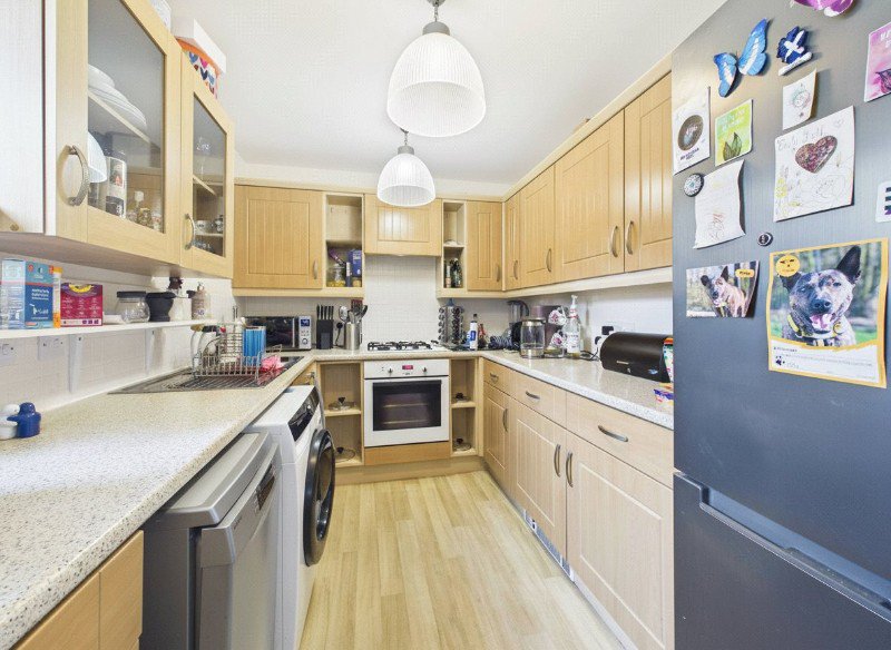 The modern kitchen has a range of wall and base units, as well as an integrated oven with a gas hob and a dishwasher. There is also space for a fridge freezer and washing machine.