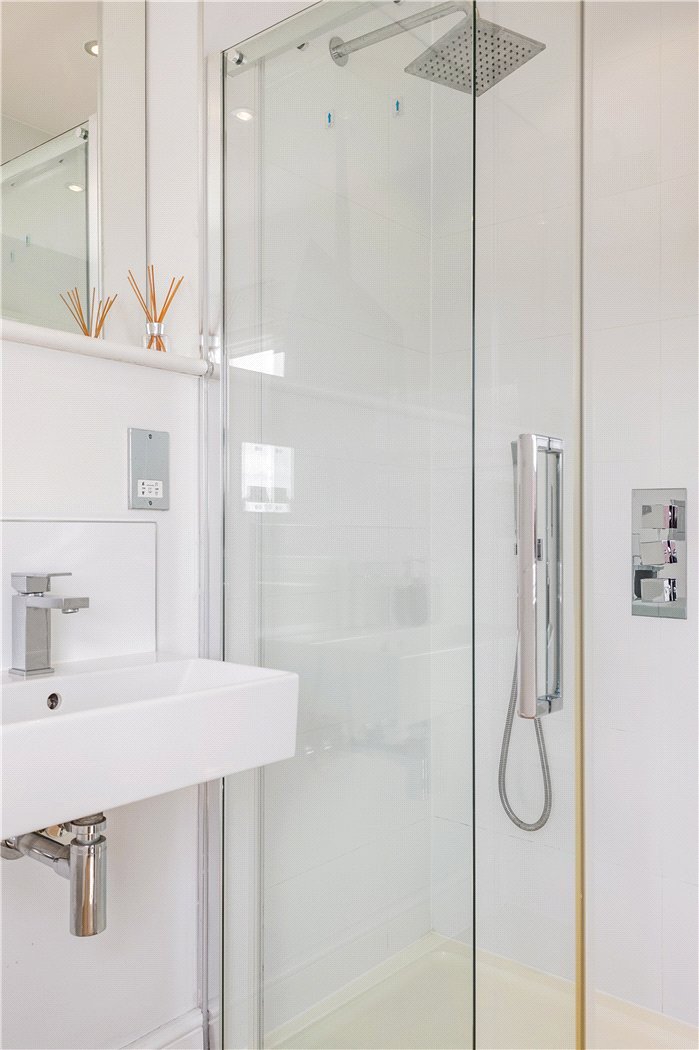 The principal bedroom is a generous double with fitted storage and an en suite bathroom. The second bedroom is also a good-sized double, served by a separate family bathroom. Both bathrooms are finished in a modern, neutral style.