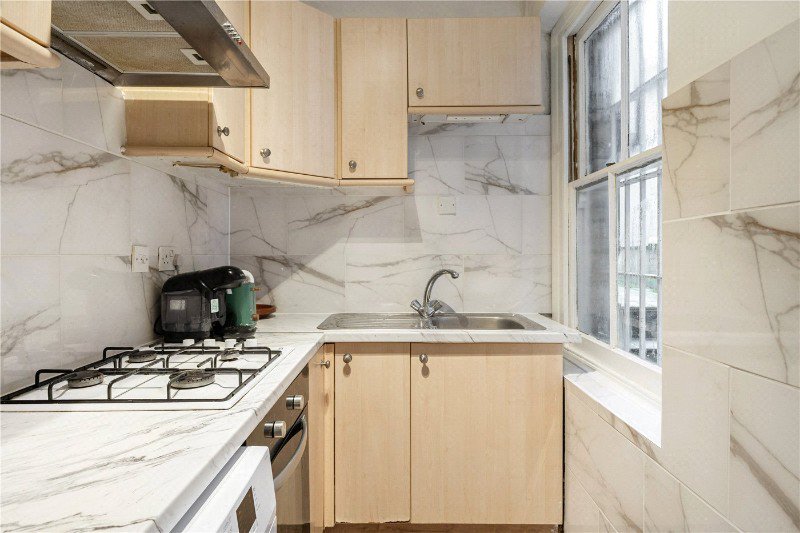 Extending to approximately 635 sq ft, the property offers a bright bay fronted reception room with built in shelving and wooden flooring. The separate kitchen is neatly arranged with good storage and worktop space.