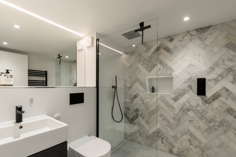 The first floor also comprises a well-proportioned double bedroom and a beautifully finished bathroom designed with a luxurious, contemporary feel. The bathroom features a spacious walk-in rainfall shower set behind a frameless glass screen, striking marble-effect herringbone tiling, recessed shelving, matte black brassware and a modern wall-hung vanity with integrated basin. Clever lighting and clean lines create a calm, spa-like atmosphere while maintaining practicality.