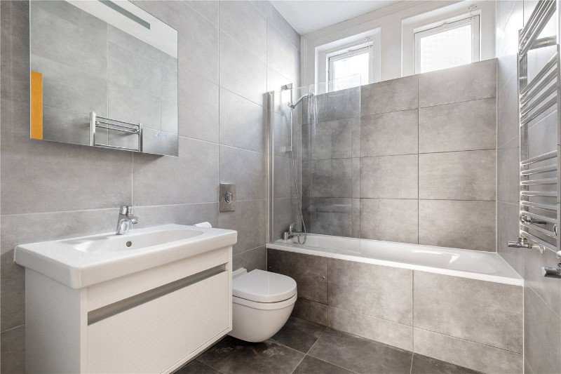 The kitchen is fitted with crisp cabinetry and integrated appliances, while the engineered hardwood flooring flows seamlessly throughout. On the lower level, a generous double bedroom is served by a wellappointed family bathroom finished with oversized tiles and elegant fittings, and the mezzanine level incorporates its own en suite for added privacy and comfort.