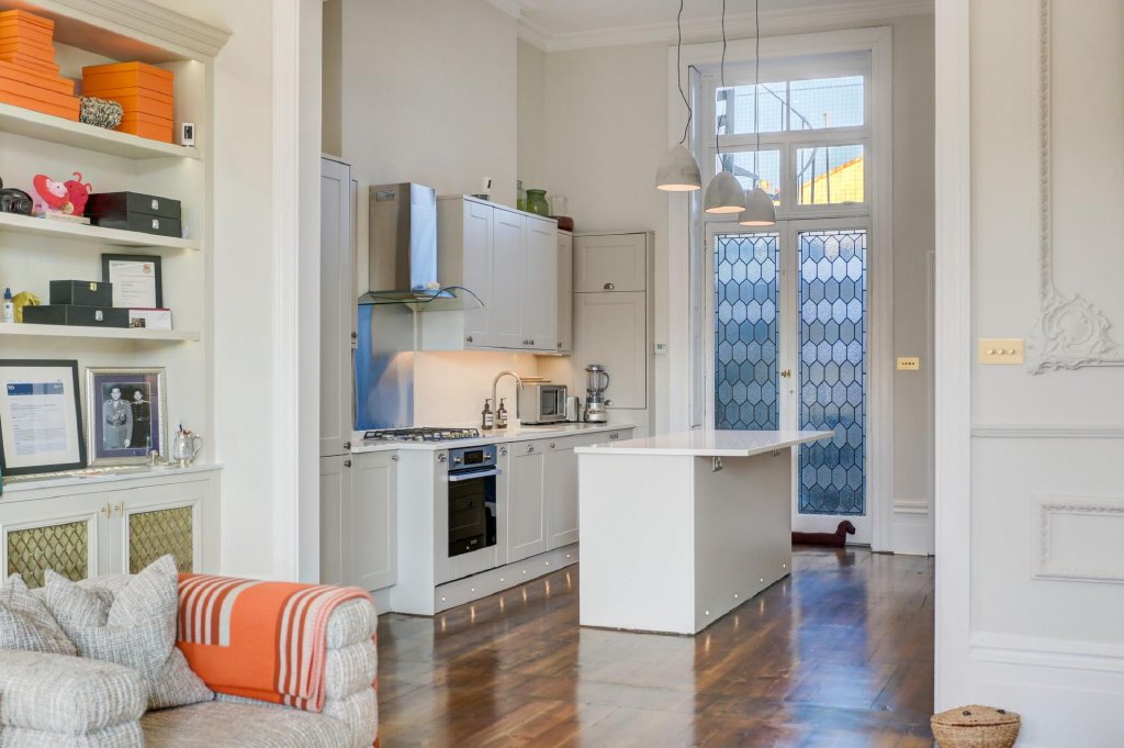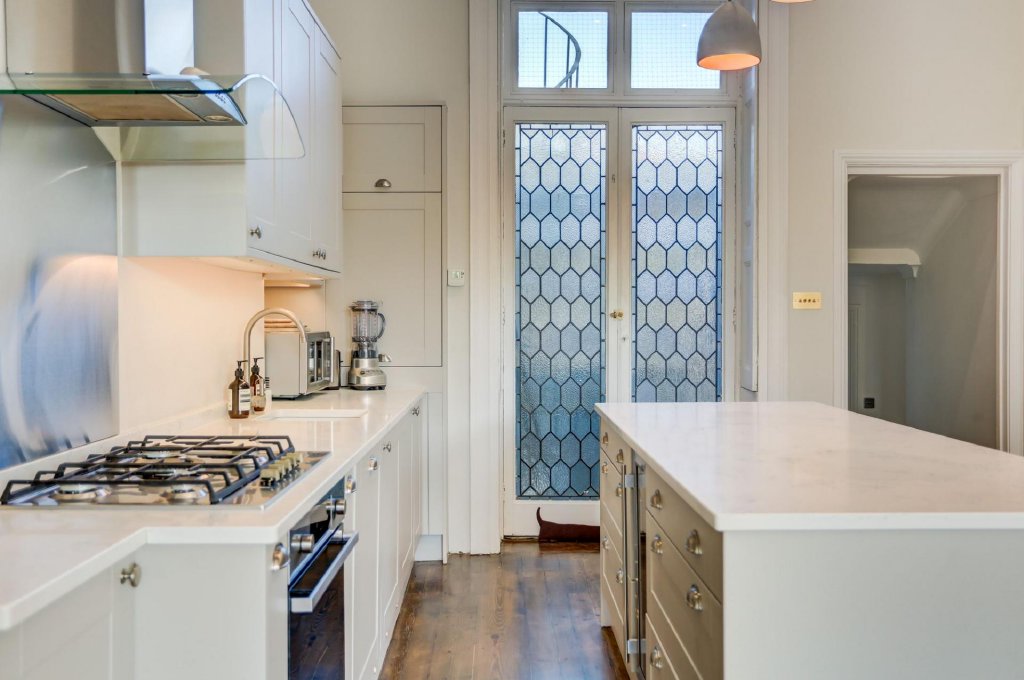 At the heart of the property lies the beautifully designed open-plan living, dining, and kitchen space. Thoughtfully arranged to create a sense of separation, the kitchen sits discreetly at the rear, expertly fitted with sleek dove-grey cabinetry, marble worktops, and a central island. Integrated appliances, including a wine fridge, gas hob, and oven, ensure a seamless and contemporary finish. A stunning set of original geometric leaded French doors from the kitchen open onto the fire escape at the rear, adding to the home’s period character. Large stained-glass doors flood the space with warm, natural light, enhancing the property's charm and character.