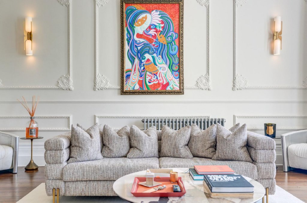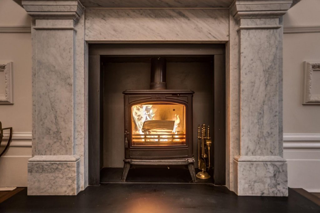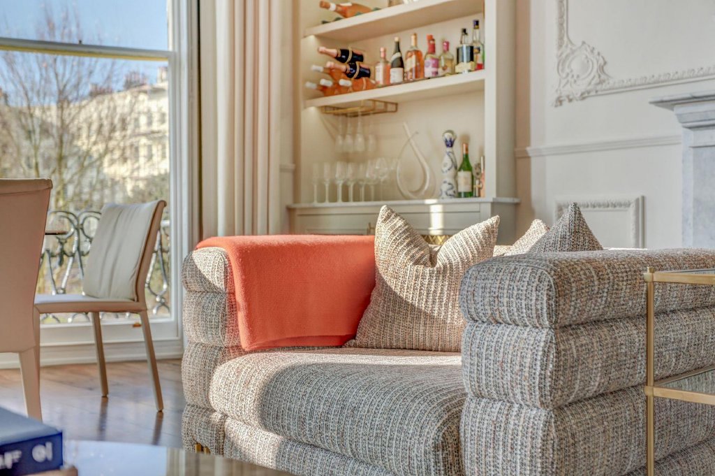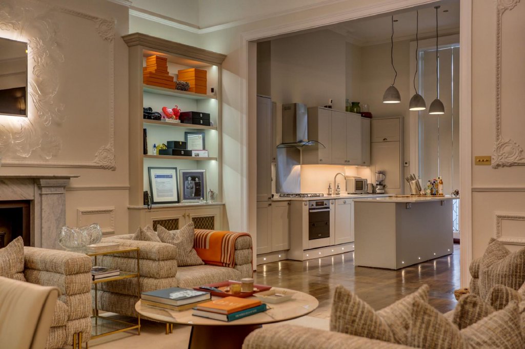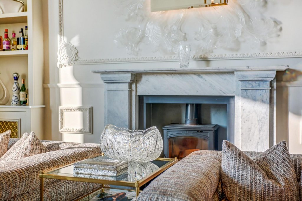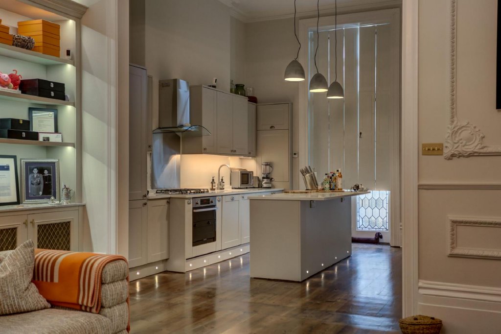 The living and dining area is a breathtaking space, where intricate acanthus plaster cornicing and Baroque wall panels frame the high ceilings and expansive walls. The striking proportions are further highlighted by the bow-fronted sash windows, which open onto a west-facing wrought iron balcony. A marble fireplace, tastefully updated with a working log burner, creates a warm and inviting atmosphere. The west-facing aspect ensures the room is bathed in golden light, which plays beautifully against the Farrow & Ball light grey walls and the rich tones of the original dark-stained wooden floorboards.