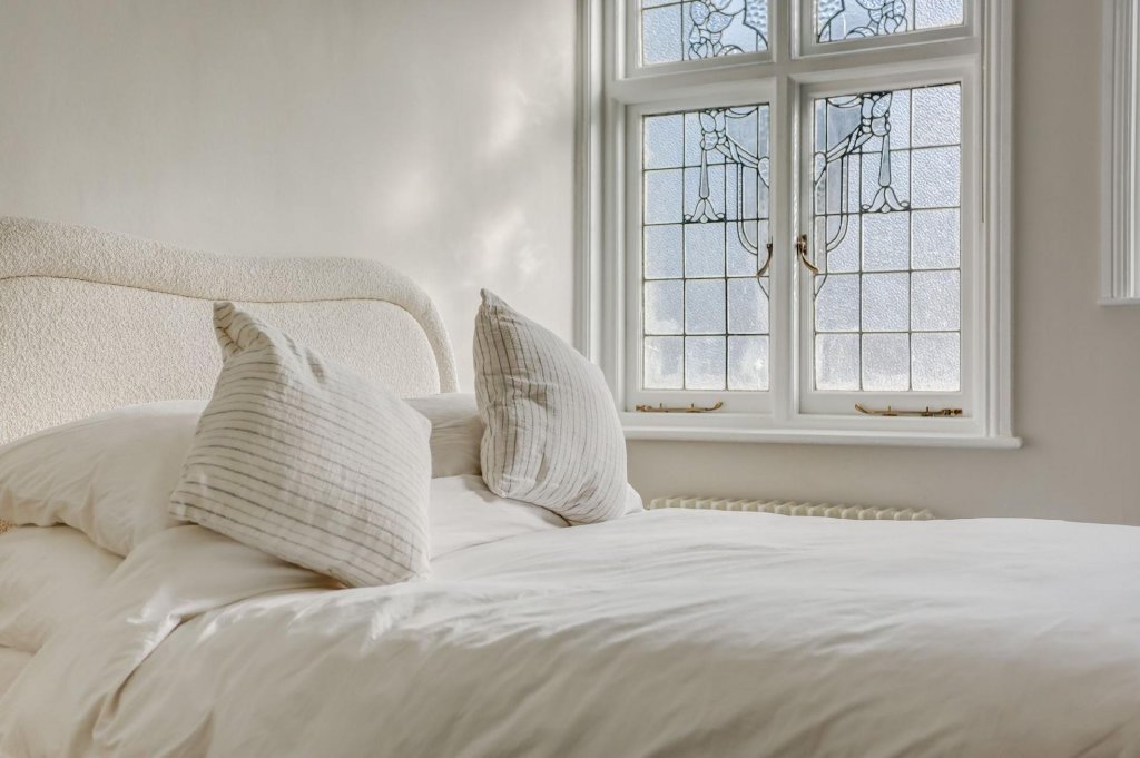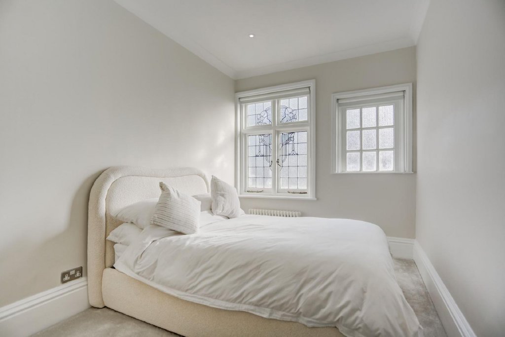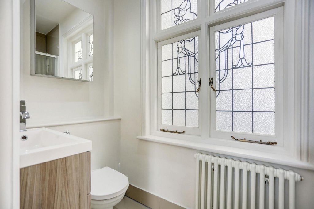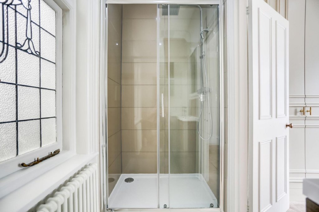 Towards the rear of the apartment, a stylish and modern family bathroom features sleek grey tiling and ample storage. There are two well-proportioned bedrooms, with the primary bedroom benefiting from a chic en-suite shower room and spacious built-in wardrobes that seamlessly complement the property’s refined period style. Decorative leaded windows are a recurring feature throughout this exceptional home, serving as a subtle yet constant reminder of its remarkable heritage and splendour.