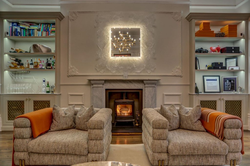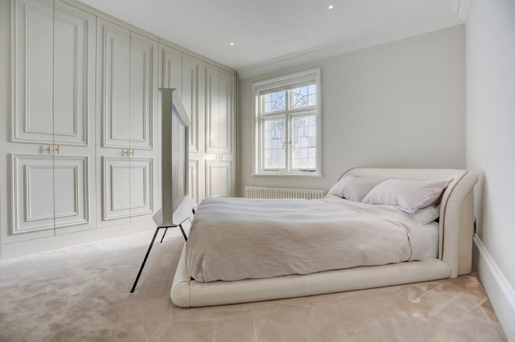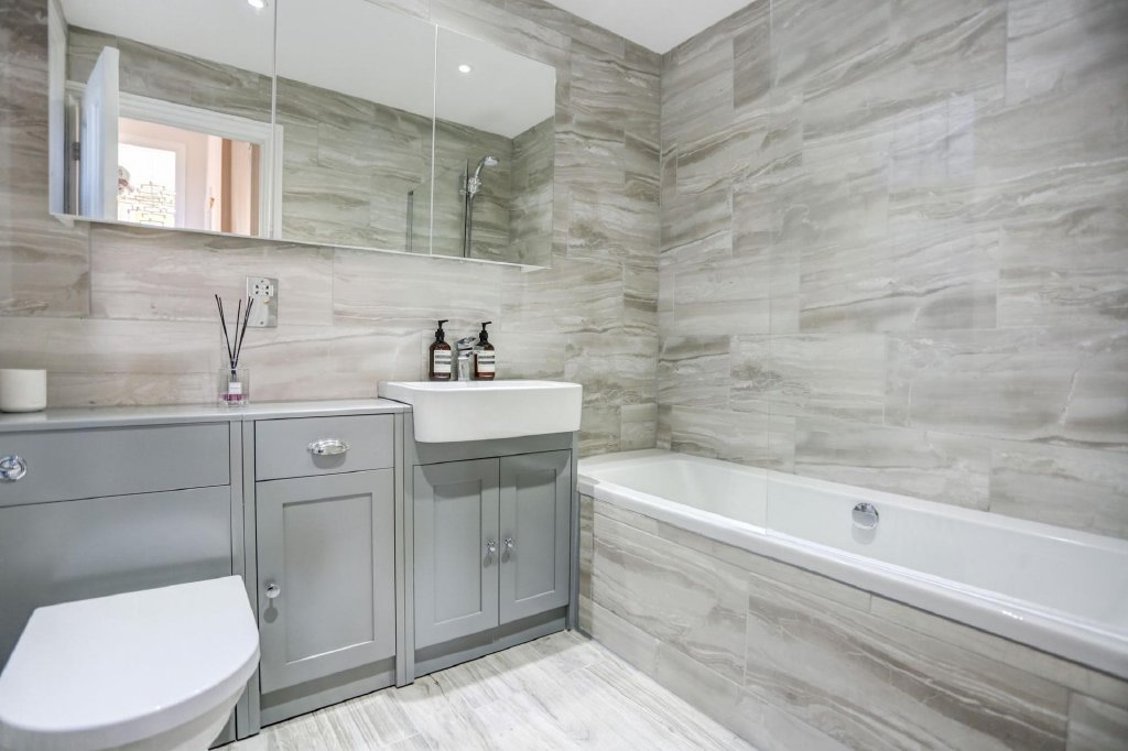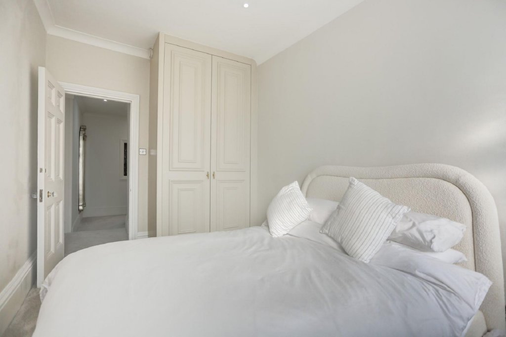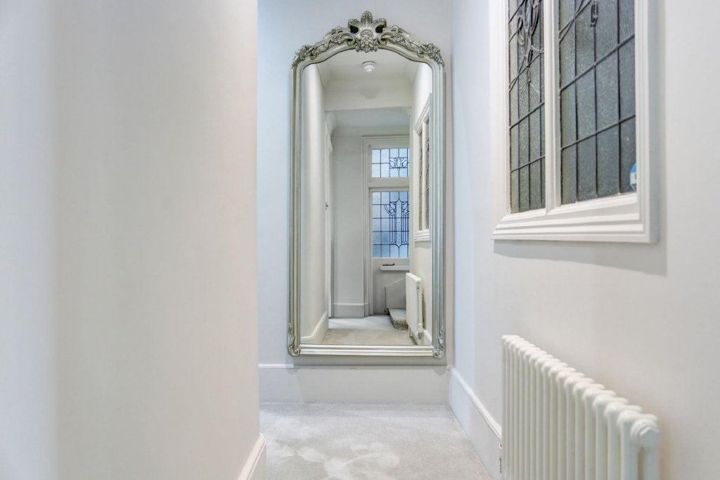 Towards the rear of the apartment, a stylish and modern family bathroom features sleek grey tiling and ample storage. There are two well-proportioned bedrooms, with the primary bedroom benefiting from a chic en-suite shower room and spacious built-in wardrobes that seamlessly complement the property’s refined period style. Decorative leaded windows are a recurring feature throughout this exceptional home, serving as a subtle yet constant reminder of its remarkable heritage and splendour.