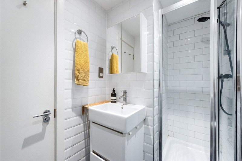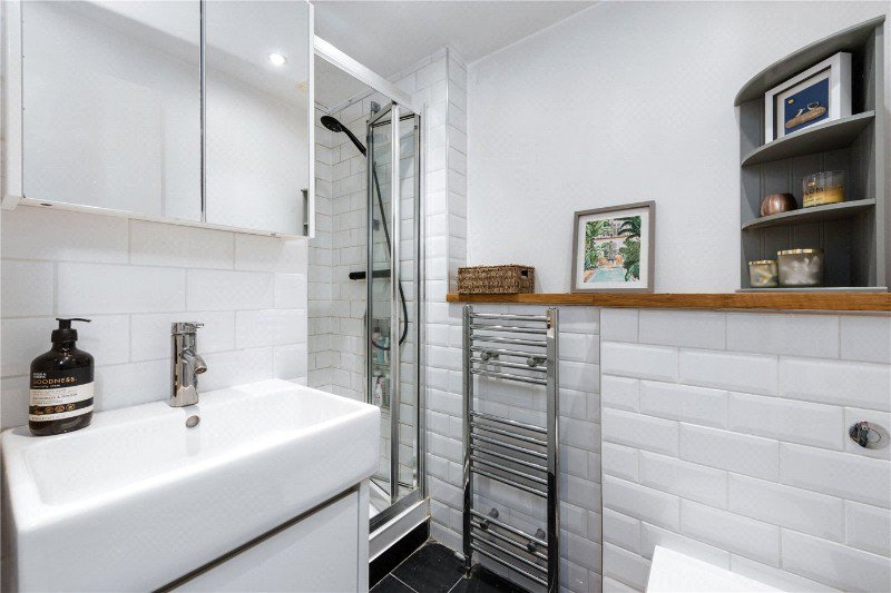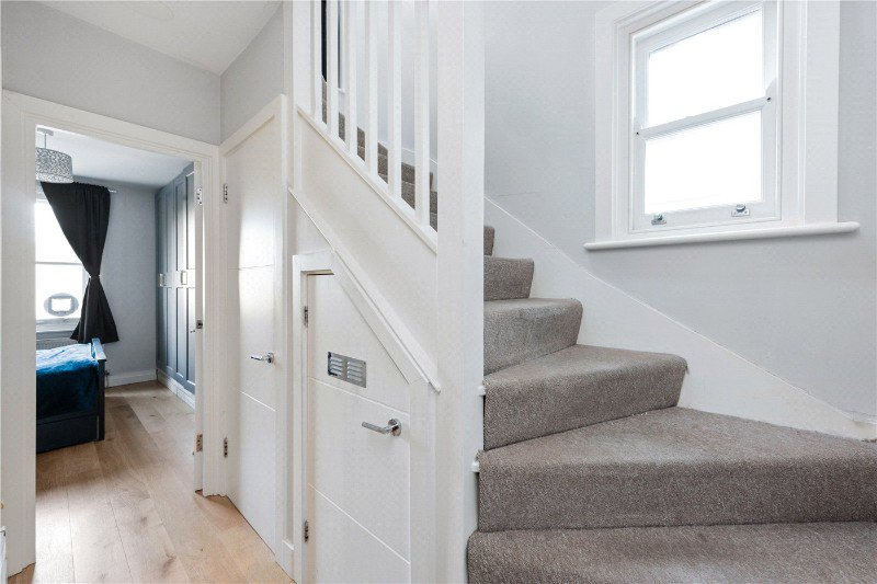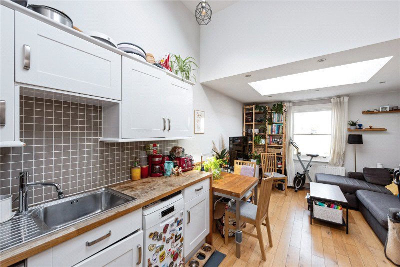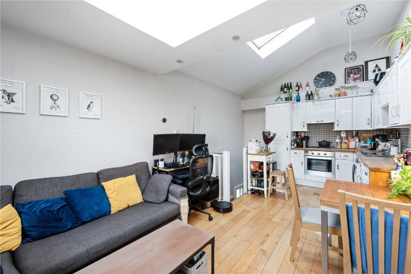 Arranged over the first and second floor, the property offers well balanced accommodation and excellent natural light throughout. The upper level provides a spacious open plan reception room and kitchen measuring over 20 ft with two skylights and attractive leafy views towards the park. The kitchen includes plenty of practical storage.