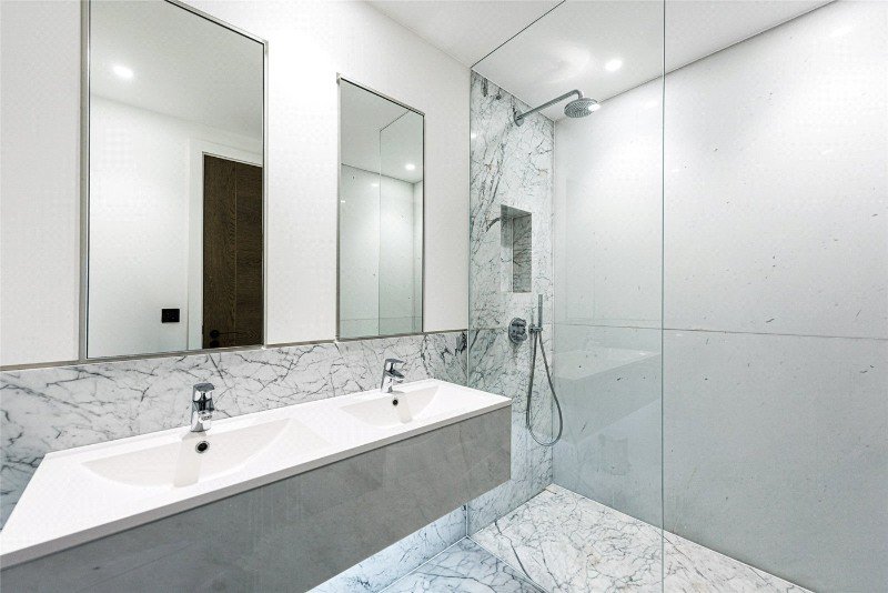 The flat covers some 913 square feet comprising a large, dual aspect reception room with open plan kitchen, two double bedroom, both with excellent storage and ensuite bathrooms and a further guest WC.