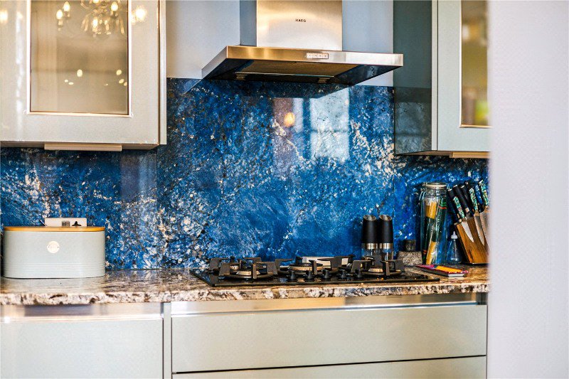The separate kitchen is well appointed with sleek cabinetry, marble worktops and a striking blue granite splashback, offering good preparation space and storage.