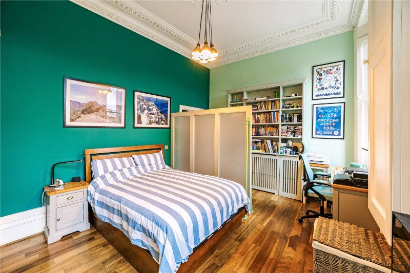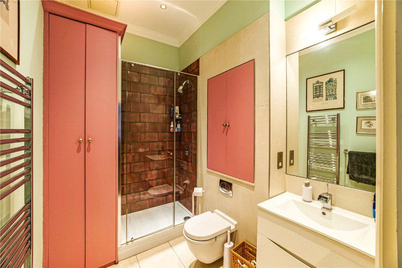 To the rear, the generous double bedroom provides a quiet retreat with built-in storage and high ceilings, while the modern shower room is finished in a clean, contemporary style.