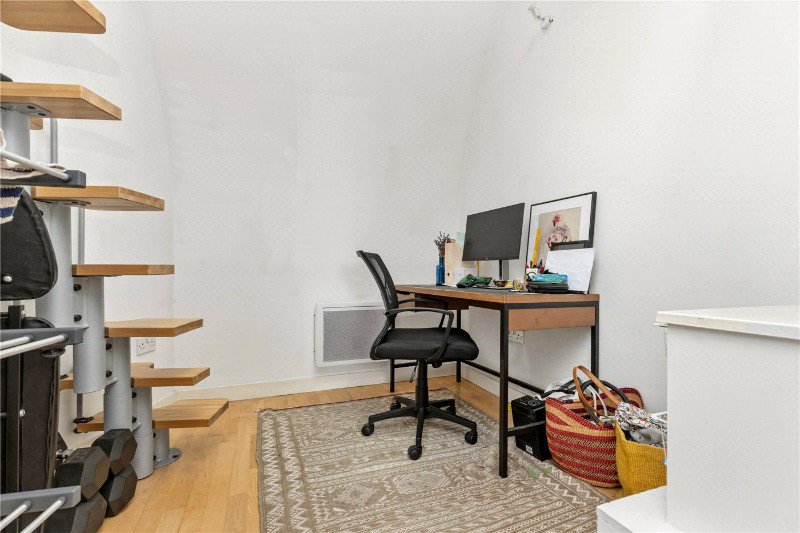 The upper floor provides two well proportioned double bedrooms, including a generous principal bedroom, together with a contemporary family bathroom. A striking mezzanine level above the main living space adds a unique architectural feature and offers a versatile area ideal for a study or additional seating space.