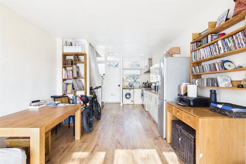 You enter on the ground floor into an impressive open-plan kitchen and living space that stretches the full depth of the home. It is an easy room to live in day-to-day, with plenty of space for a dining table, a comfortable lounge set-up, and a long run of fitted units to the kitchen end. At the far side, doors open out onto a private balcony, giving you a lovely elevated spot for a morning coffee or an evening drink with leafy views beyond.