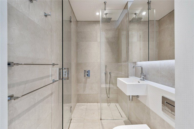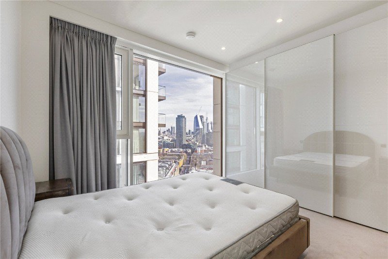 Following the hallway round leads to the second bedroom, which once again offers a generous footprint for a double bed and built-in storage. The bedrooms are also defined by impressive floor-to-ceiling windows, which pull the city skyline into the room and provide an unmistakably bright, high-aspect feel to the entire sleeping area.