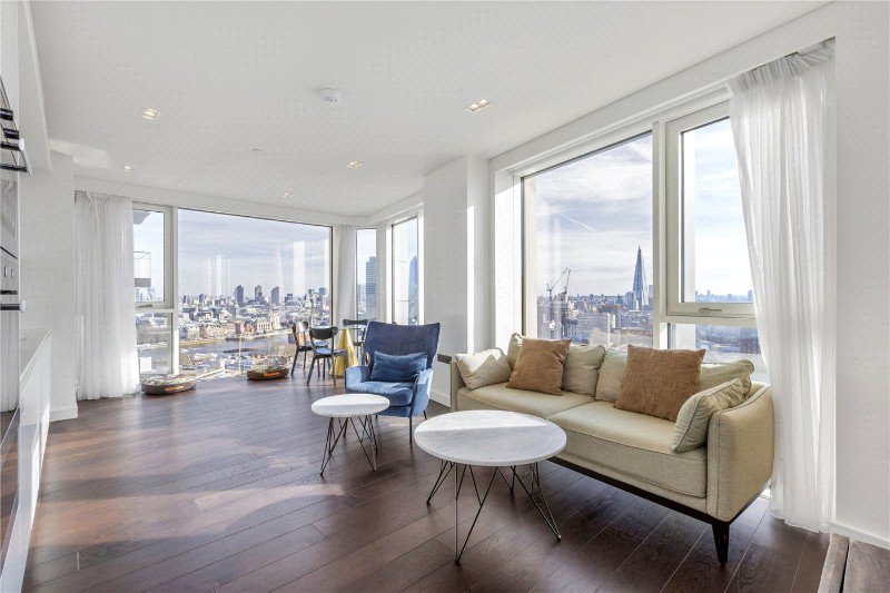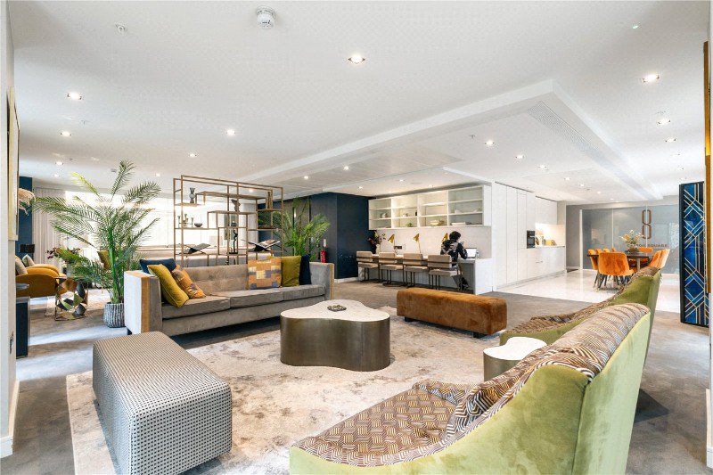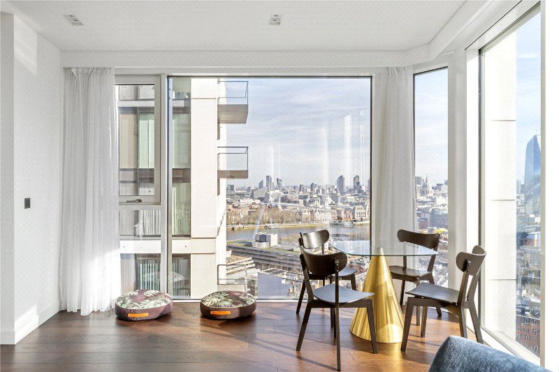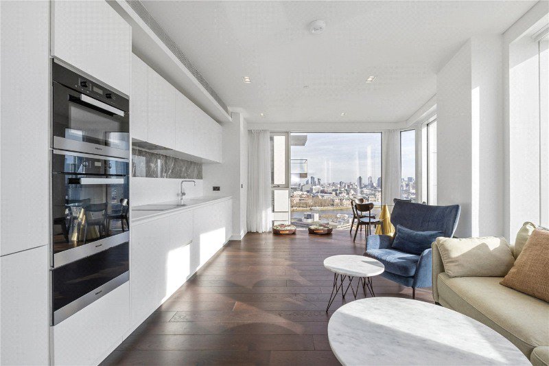 The heart of the apartment is the breathtaking open-plan living, dining, and kitchen area. This expansive space is defined by spectacular floor-to-ceiling windows and continued dark wooden flooring, giving the main social hub of the home a unique and unobstructed view of the City of London and the River Thames.