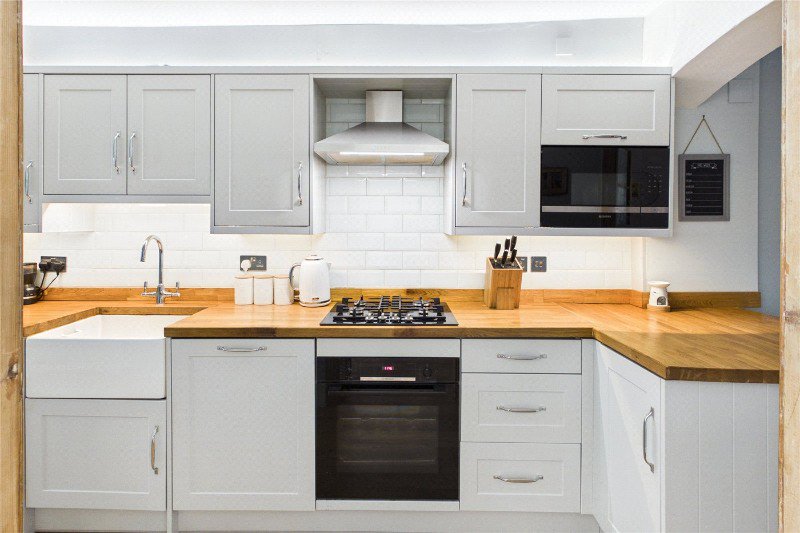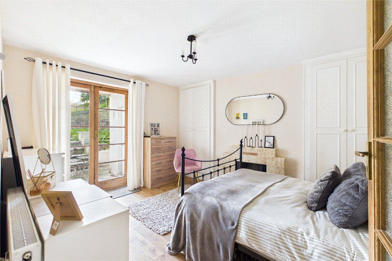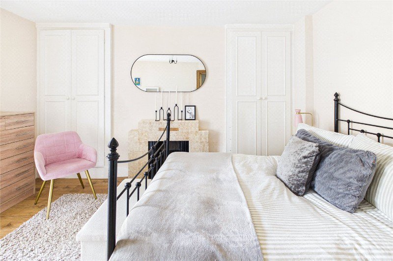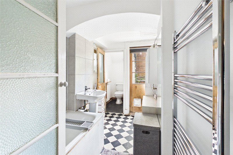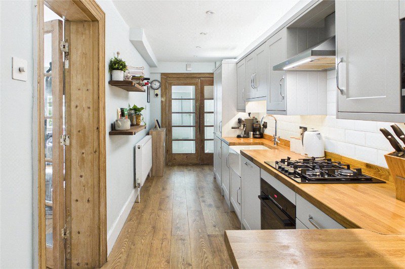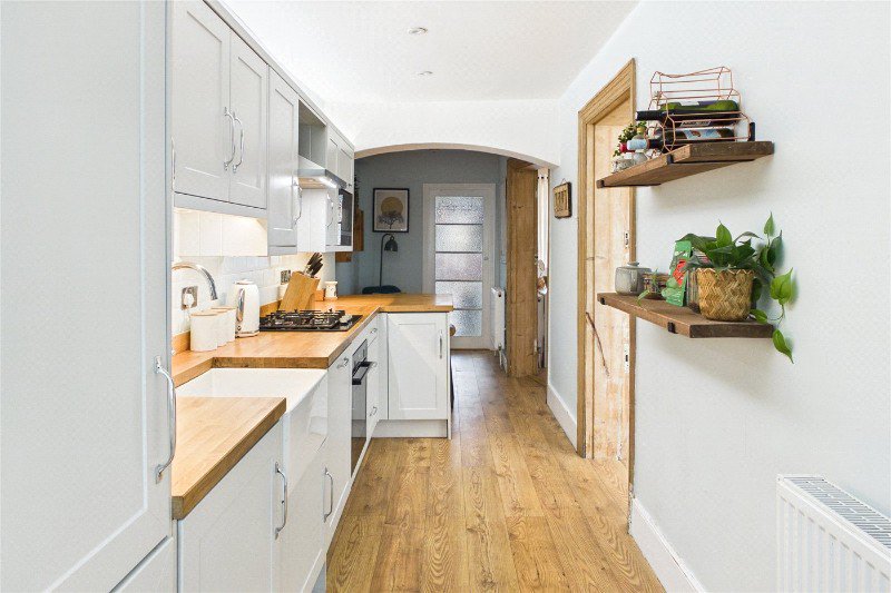 Running alongside the hall is a smart galley-style kitchen, offering good worktop space and storage, and updated in recent years with thoughtful modern touches including smart lighting. To the rear, the double bedroom is quietly positioned away from the front aspect, creating a restful retreat with built-in wardrobes. The bathroom sits off the hallway and is complemented by a separate WC, a practical bonus for guests and everyday living.