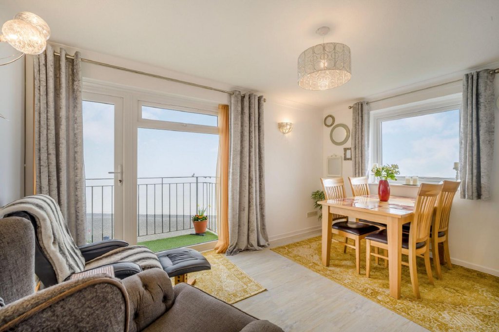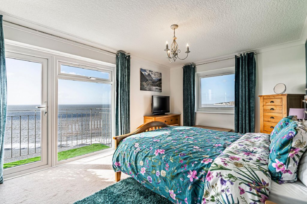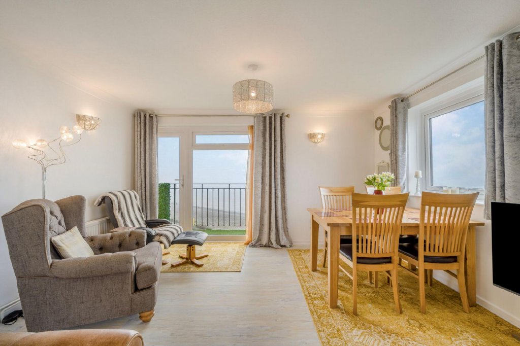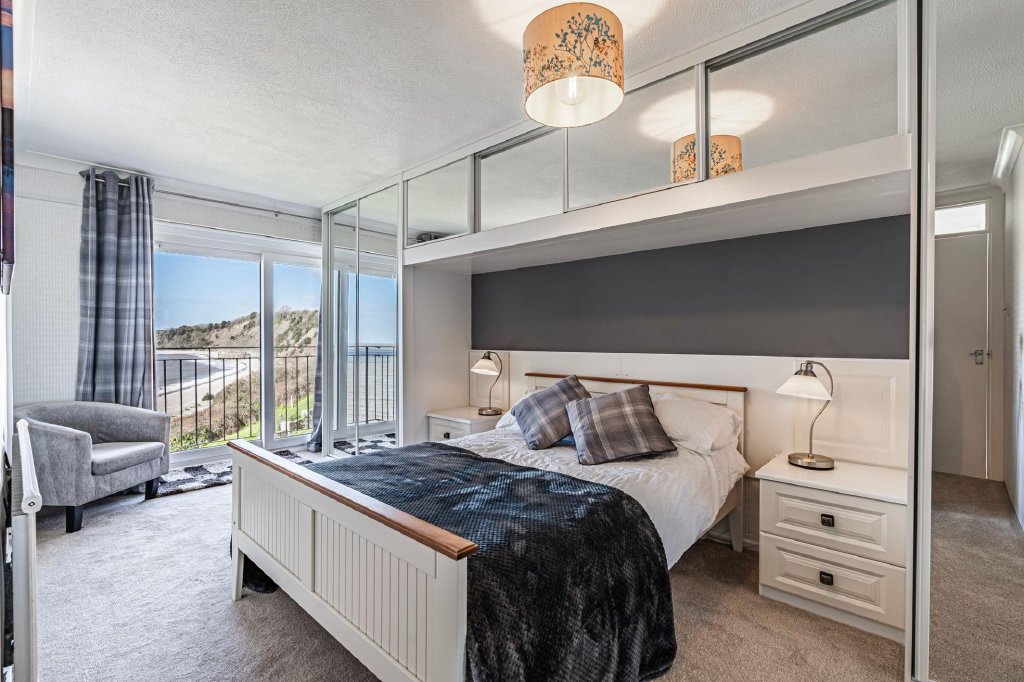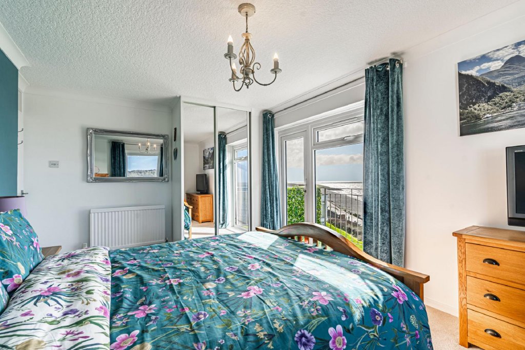At the heart of the home is the spacious open-plan living and dining area, a light-filled space ideal for both everyday living and entertaining. Large glazed doors open onto the private balconies, allowing residents to fully enjoy the uninterrupted views across the sea.The open layout creates a welcoming and sociable enviroment while perfectly framing the surrounding seascape. On the same floor is a large kitchen with dual aspect and a cloakroom housing a recently installed combination boiler.