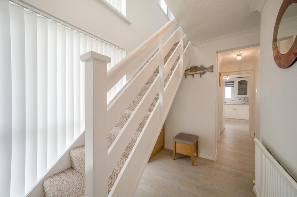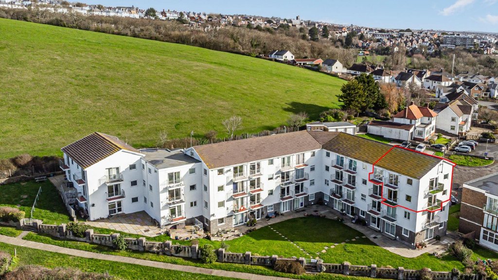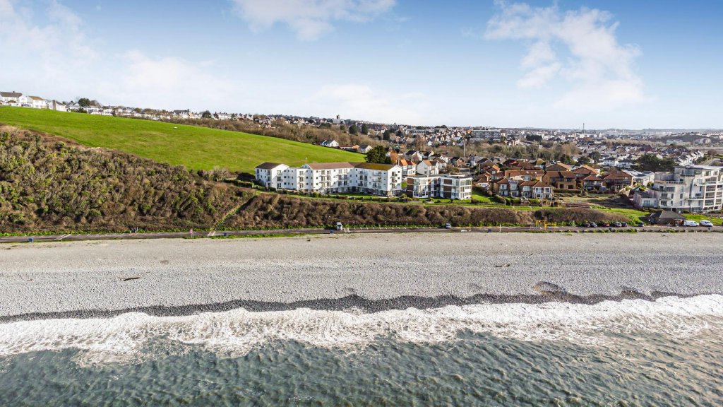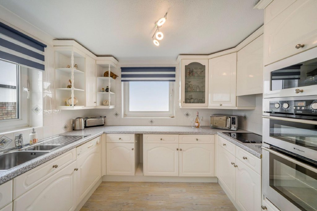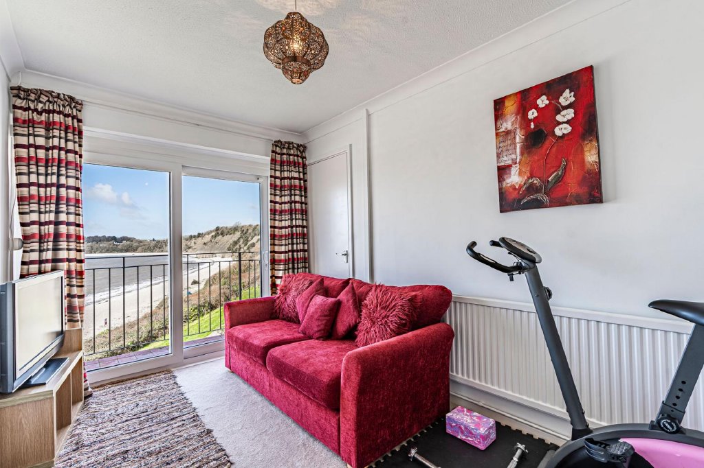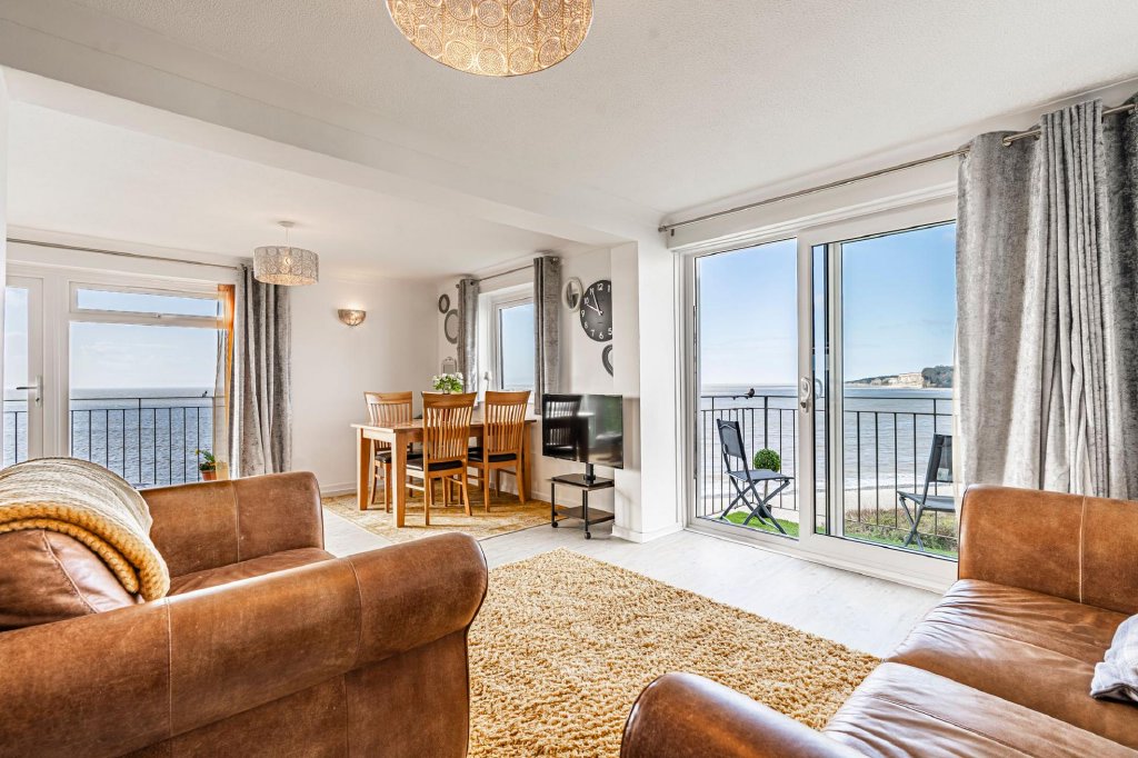 At the heart of the home is the spacious open-plan living and dining area, a light-filled space ideal for both everyday living and entertaining. Large glazed doors open onto the private balconies, allowing residents to fully enjoy the uninterrupted views across the sea.The open layout creates a welcoming and sociable enviroment while perfectly framing the surrounding seascape. On the same floor is a large kitchen with dual aspect and a cloakroom housing a recently installed combination boiler.