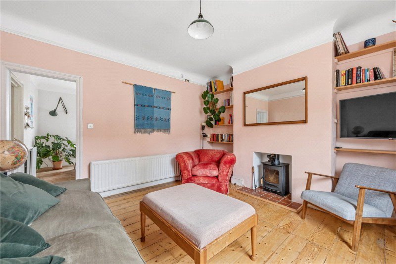 The living room is just off the kitchen and is a generous size with lots of natural light and plenty of space for sofas, a coffee table, tv and any other freestanding furniture you would like. There is also a charming fireplace with bookshelves either side for additional storage.