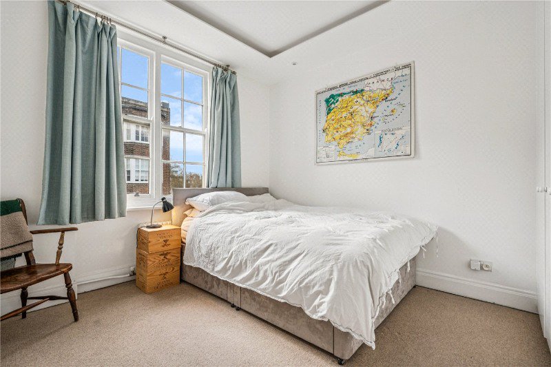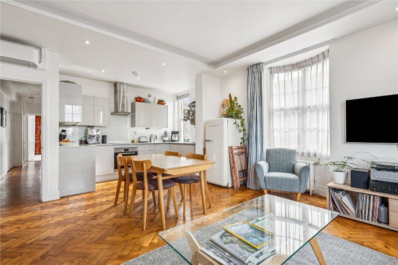 Spanning 822 sq ft on the sixth floor, with lift access, this thoughtfully updated apartment is filled with natural light thanks to windows on three sides, offering far-reaching views across surrounding rooftops toward Kensington Gardens. The layout includes an open-plan kitchen, dining, and reception room featuring two bay windows, alongside the original parquet flooring, carefully restored and polished, which extends into the hallway. From there, you’ll find two generously sized double bedrooms and a sleek, fully tiled bathroom. Both the principal bedroom and the kitchen/reception space are equipped with air conditioning.