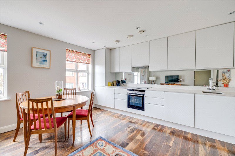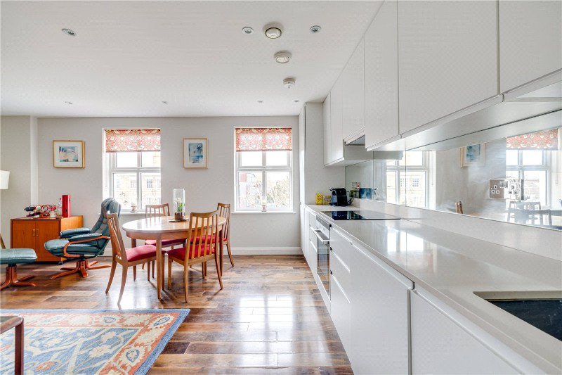 The flat is on the second floor of the building and is sold with an additional 80ft storage room in the lower ground floor. It offers excellent open plan living with a modern kitchen, wooden flooring and plenty of space for a dining table as well a large reception space. The two bedrooms are both of generous proportions, one of which has an ensuite shower room and the second bedroom is served by a separate bathroom.