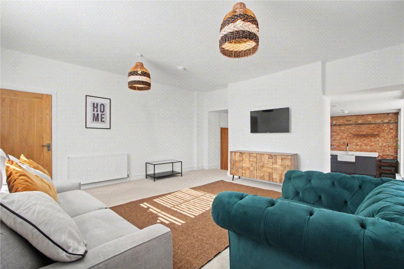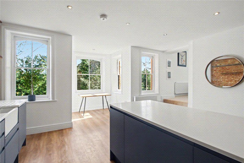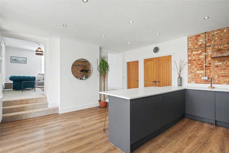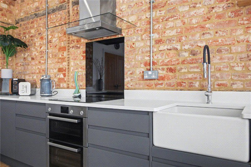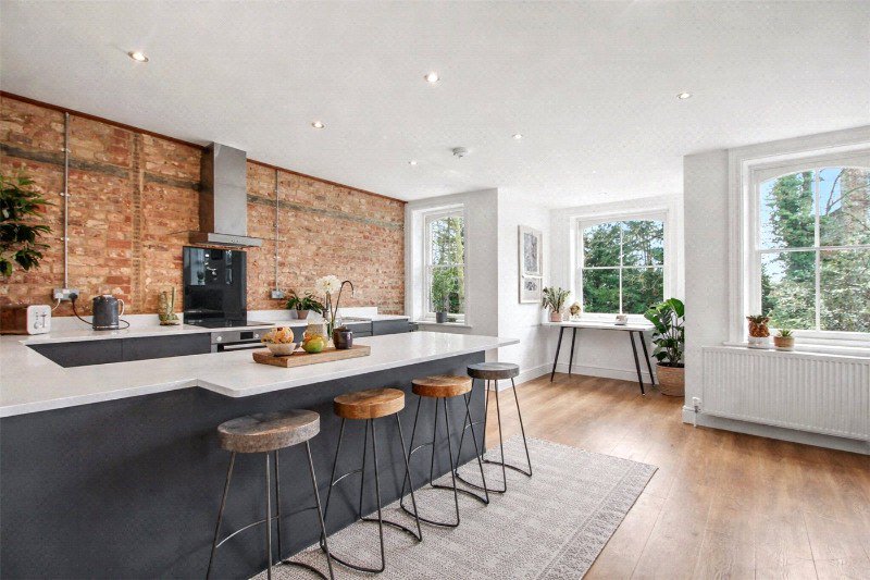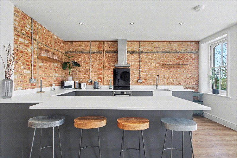 At the heart of the home lies a stunning, statement kitchen. A striking exposed brick feature wall beautifully complements the bespoke fitted units, while the rare triple-aspect outlook floods the space with natural light and provides an impressive, far-reaching view. Designed with both style and functionality in mind, this is a space that is as practical as it is visually captivating.