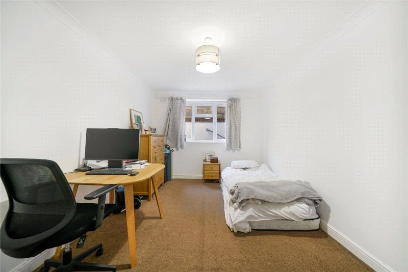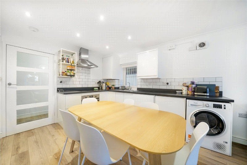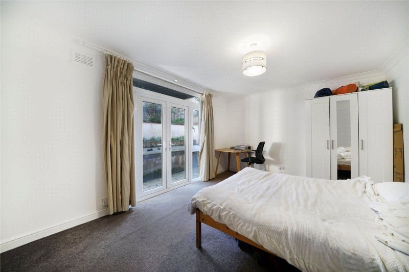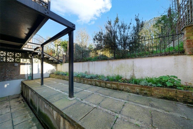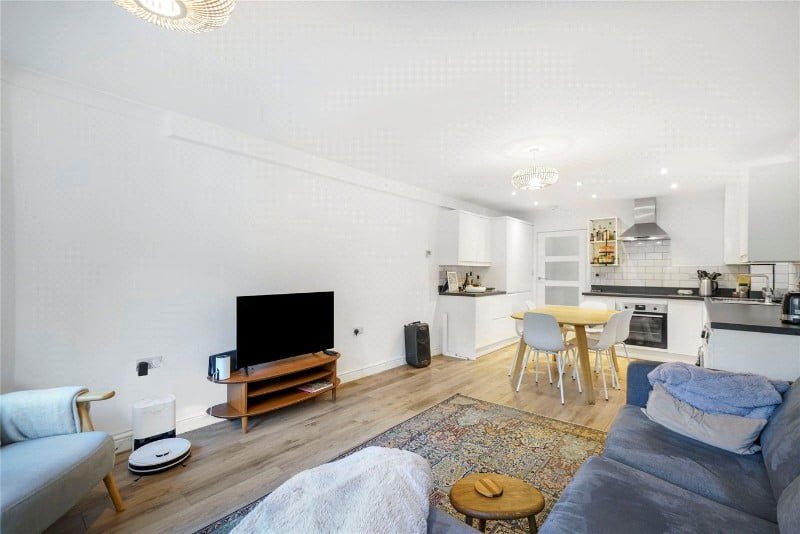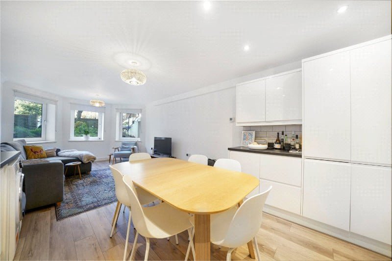 The flat, which has its own entrance to the side of the building, comprises a reception room with an open plan kitchen, a bathroom, two bedrooms and direct access to a private rear patio garden.