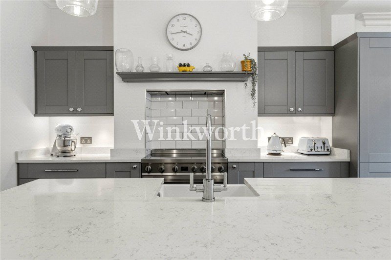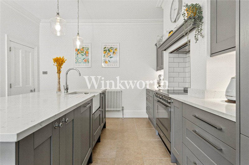 The property offers just under 1,000 sq ft of impressive living accommodation, enhanced by high ceilings throughout and stylish décor in Farrow & Ball colours. At the front of the flat is a spacious reception room, while the heart of the home is a stunning eat-in kitchen featuring an extensive range of wall and base units, space for a double oven, a central island, and ample room for a dining table.