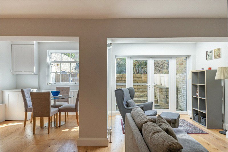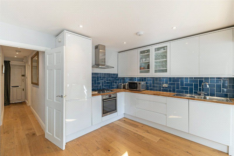 The property offers a bright and spacious open plan kitchen and reception room, creating an excellent entertaining space. The kitchen is sleek and contemporary, with clean white cabinetry, wooden worktops and a striking blue tiled splashback, while the reception area is flooded with natural light from large glazed doors opening directly onto the garden.