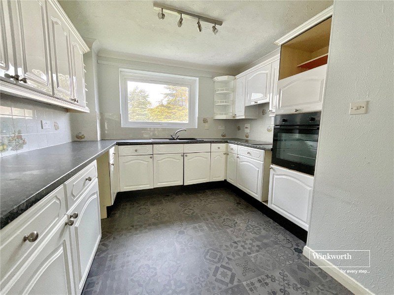 The generous sized living room opens through to the southerly facing sunroom, with steps leading to the front communal grounds. The kitchen/dining room is also of a good size with work surface in part to three walls, and space for a kitchen table.