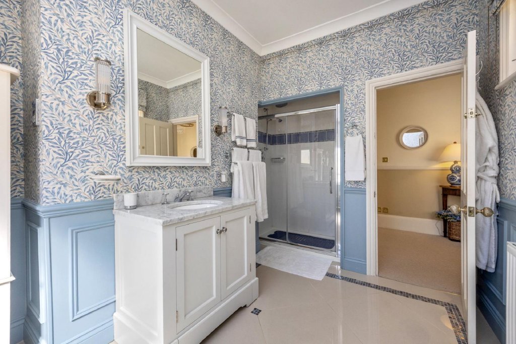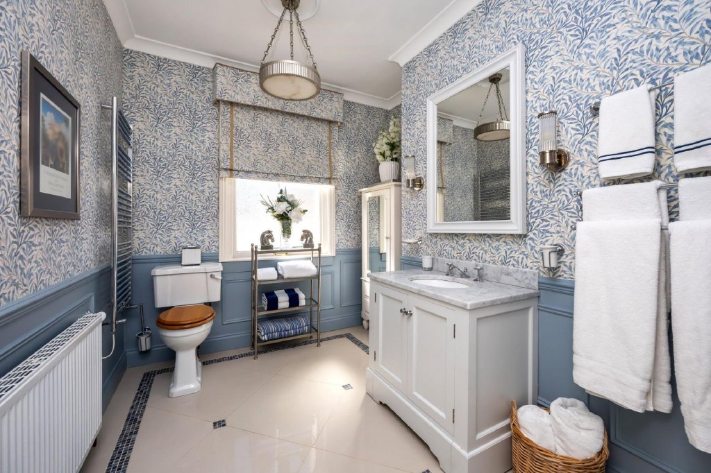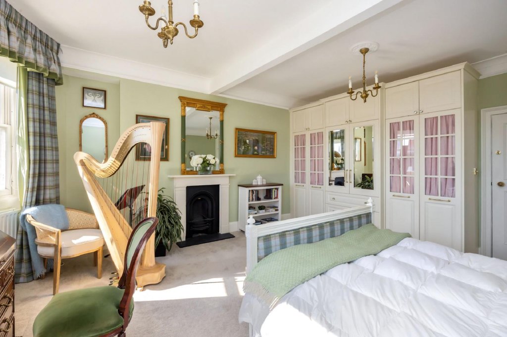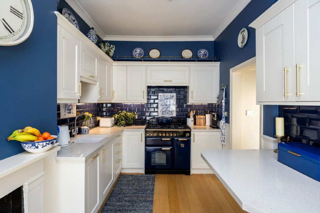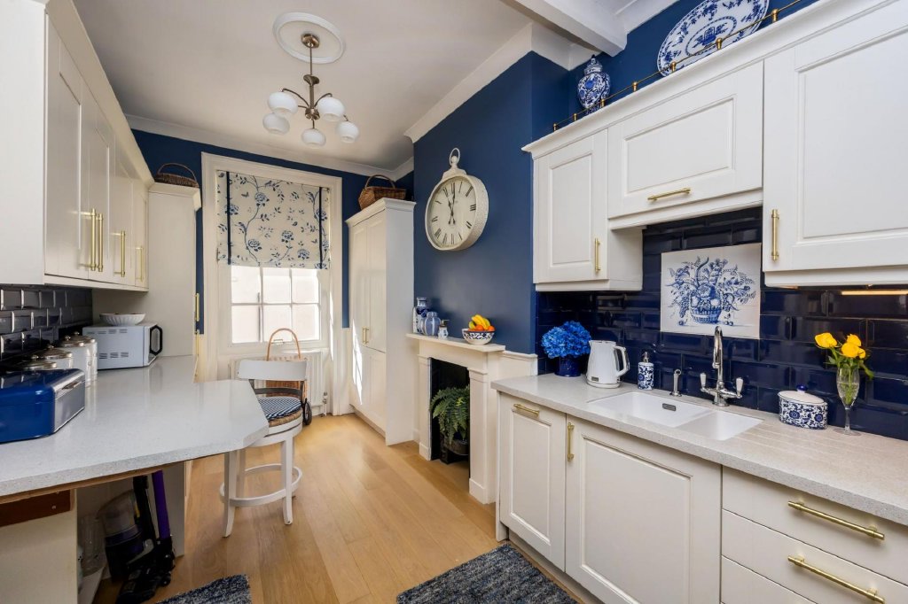 To the rear, the kitchen is well equipped and thoughtfully finished, with a good range of fitted wooden cabinetry painted in cream, complemented by Oxford blue tiling and two exquisite Delft tiled panels. Granite stone composite worktops provide a durable finish, and integrated appliances include a gas fired Rangemaster stove, dishwasher, fridge freezer and an additional fridge. Underfloor heating provides further comfort.