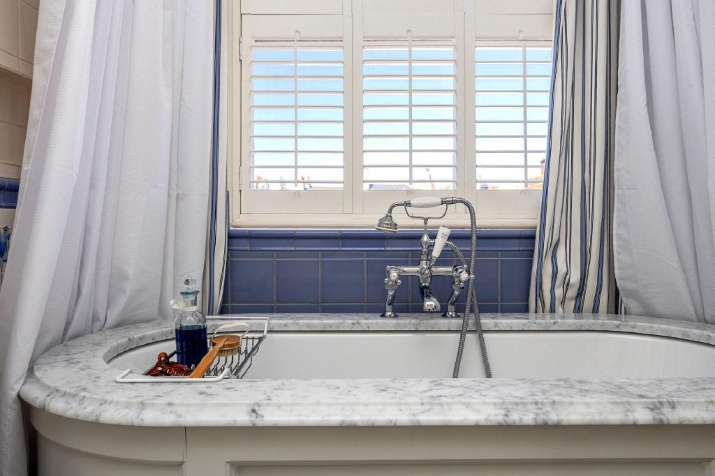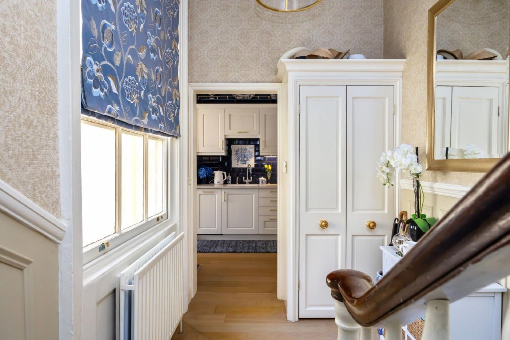 The main reception space sits to the front of the house, where tall pocket sash windows open onto the front balcony and frame sea views. A Chesneys marble fireplace with gas fire provides an elegant focal point, topped by a gilded Overmantles mirror. The living area opens to the dining room, creating a superb arrangement for both day to day living and entertaining. The sitting room, dining room and landing are all finished with light wood flooring laid in Versailles panels.