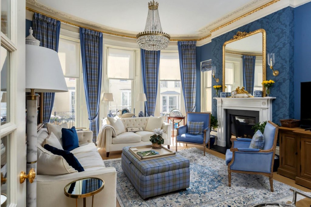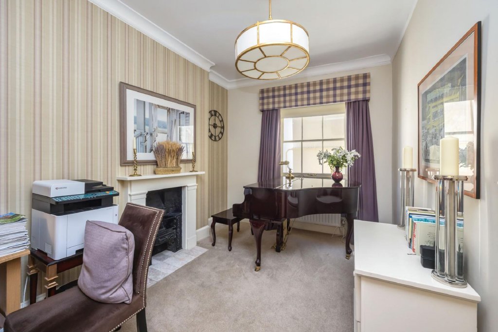 The stuccoed façade is classically elegant, with bow fronted bays and tall sash windows that give the building a wonderful sense of scale and presence. Internally, the home offers generous Georgian proportions and notably high ceilings, with an immaculate level of finish throughout. Period inspired detailing has been thoughtfully incorporated, including gilded cornicing to the principal rooms, selected Sherle Wagner Louis XVI door knobs, Stephenson’s of Norwich ceiling roses and chandelier fittings.