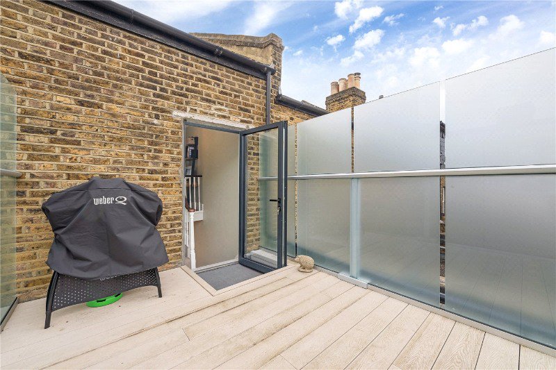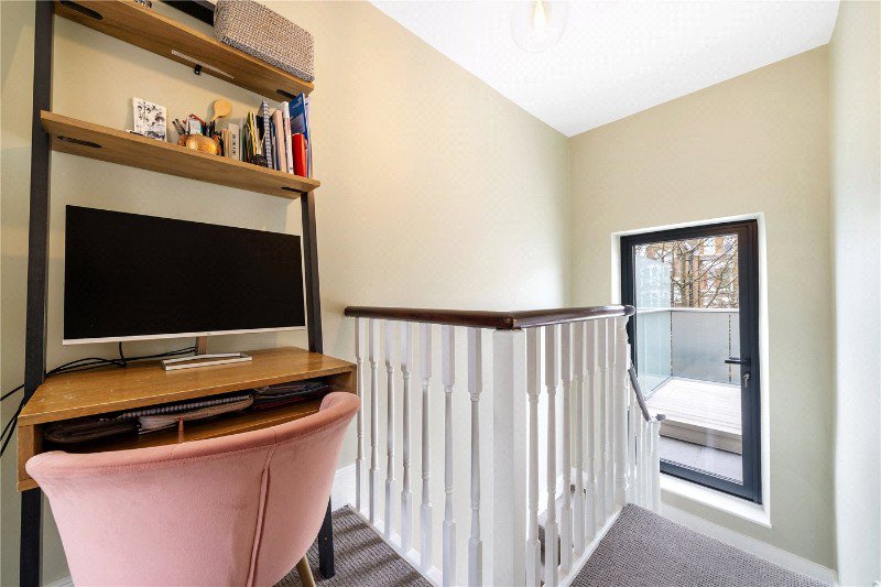 Upstairs, the second floor hosts two well-proportioned double bedrooms. The principal bedroom spans over 15 ft and benefits from built-in storage, while the second bedroom provides a comfortable guest room, nursery or home office. A modern family bathroom completes the accommodation. From the landing, doors open onto a private terrace, offering a charming outdoor space ideal for morning coffee or evening relaxation.