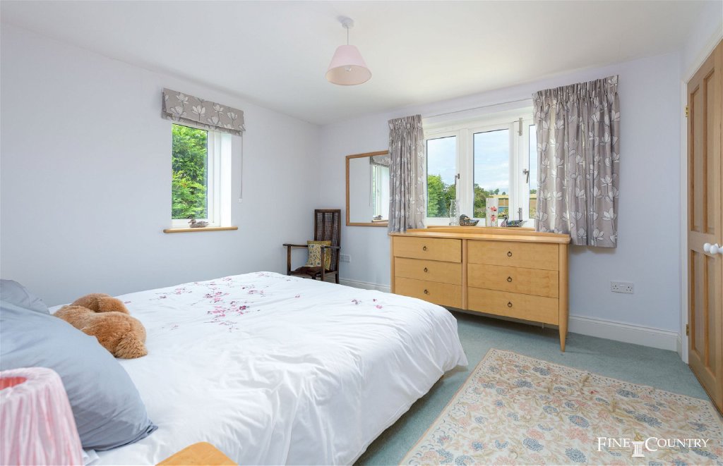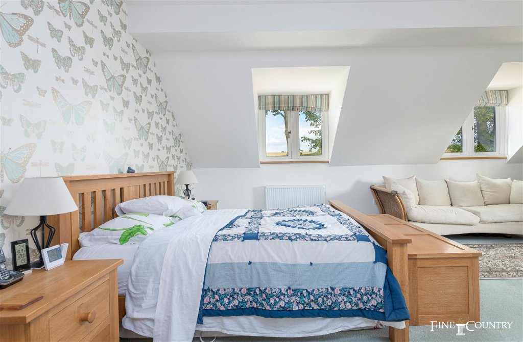 Tucked away from the lane, Ash House is cocooned by peaceful and private gardens that envelop two sides of the property. Along the front, a raised border adorns the drive, while majestic mature trees line the lane, revealing open fields beyond. Enclosed by hedging, willow fencing, and stone walls, the main garden unfurls around the side and back of the house, adorned with expansive lawns and charming borders of cottage-style plants, including lavenders, roses, and flowering shrubs. A splendid south-facing terrace stretches along the rear of the house, offering numerous secluded spots for outdoor seating.