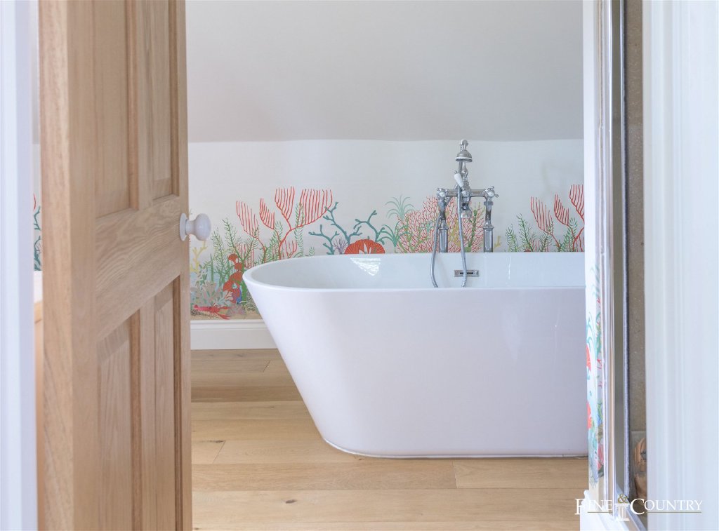 Ascending the oak staircase from the hallway, you will find yourself on the wide, first-floor galleried landing. The first floor of Ash House is dedicated to six double bedrooms, some featuring built-in wardrobes, while one boasts a Juliet balcony overlooking the garden. Additionally, the spacious loft, accessible via a drop-down ladder from the landing, spans the length of the property. Fully boarded, with power and lighting, this versatile space is ideal for storage or the creation of additional accommodations (subject to planning permission).