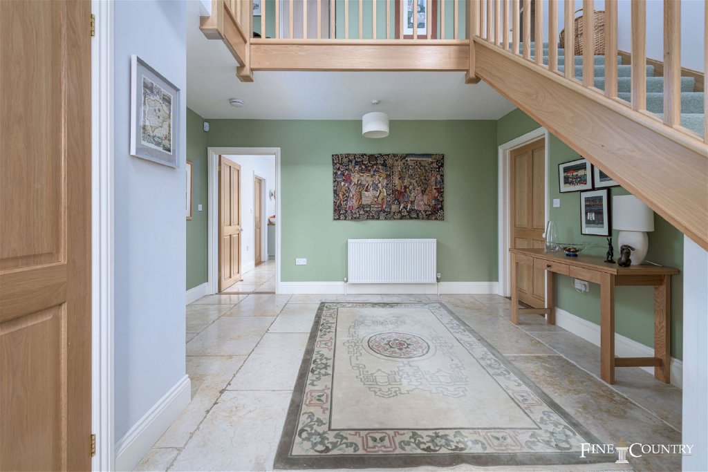 Approaching the property through double gates, a gravel drive welcomes you, providing ample parking space in front of the house and garage. Descending the steps, an impressive stone porch and front door beckon you into a spacious entrance hall. Here, a grand double-height ceiling and front-facing windows bathe the space in natural light. From the entrance hall, access is granted to the main reception rooms and the kitchen/breakfast room.