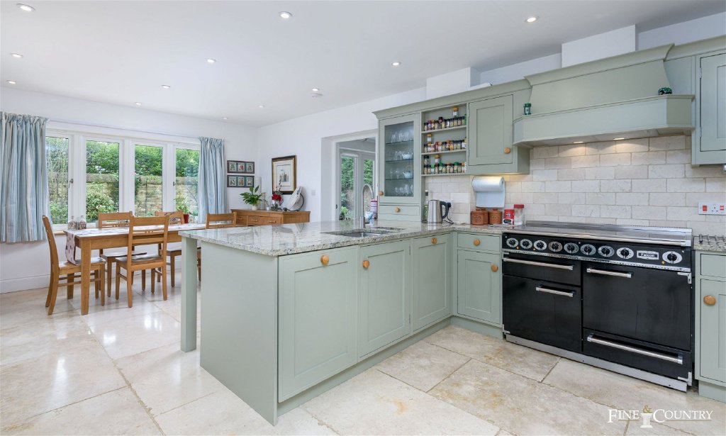 The main reception room, stretching almost the entire width of the house, exudes elegance with its large window overlooking the front garden and a striking stone fireplace adorned with a wood-burning stove. At the other end of the reception room, French doors open into the garden room, creating a seamless connection to the kitchen and offering picturesque views of the enchanting garden.